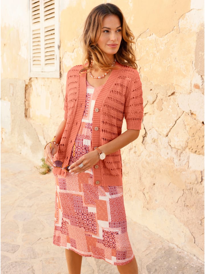 Ажурный кардиган из легкой букле - идеальный многослойный предмет одежды. Горизонтальный узор, V-образный вырез и планка с пуговицами по всей длине. Короткие рукава, манжеты и низ в рубчик. В поддержку инициативы «Сделано в Африке» (Collot made in Africa).