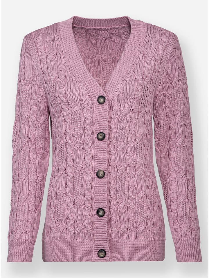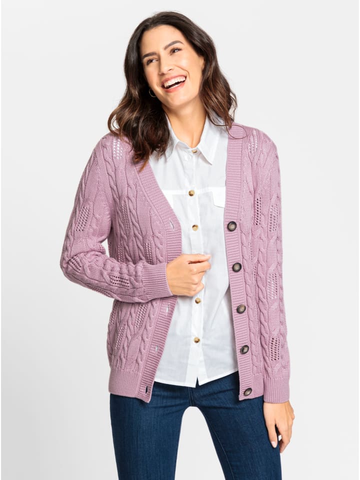 Сочетание косичной вязки и воздушных ажурных узоров придает этому кардигану неповторимый характер. Тщательно связан по фигуре. V-образный вырез и планка с пуговицами, широкая резинка и контрастные пуговицы с роговым эффектом. Эластичные манжеты на длинных рукавах и подоле с резинкой. В поддержку инициативы «Сделано в Африке» (Cat. Made in Africa).