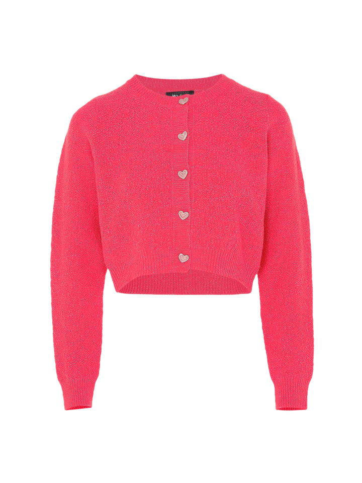 Обновите свой гардероб этим вязаным кардиганом, впечатляющим укороченным кроем и круглым вырезом в рубчик. Длинные рукава с манжетами в рубчик добавляют элегантности, а пуговицы в форме сердца по центру застежки добавляют очаровательную деталь. Ребристый подол, создающий впечатление длины до талии, делает этот кардиган непринужденным и женственным, подходящим для любого случая. Эта модель, разработанная совместно с aleva, сочетает в себе вневременной стиль и современный дизайн.