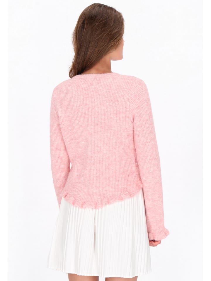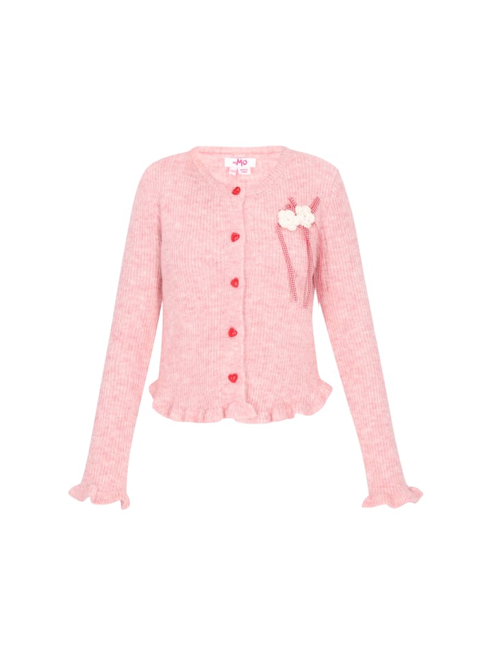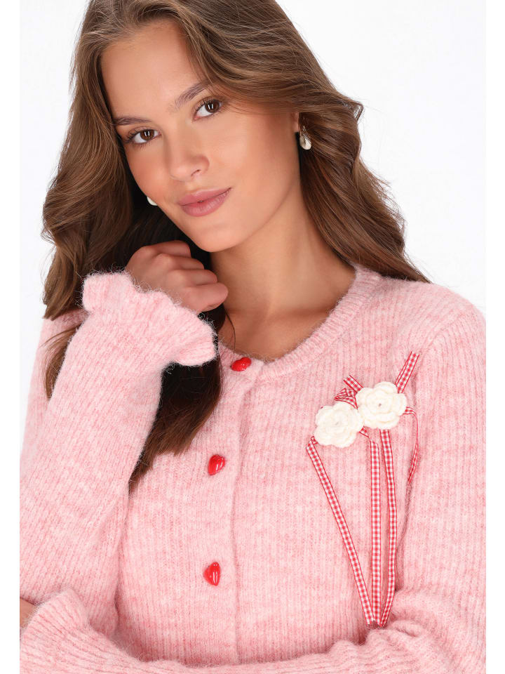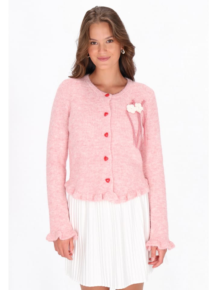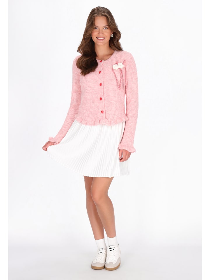 Очаровательный и удобный кардиган, идеально подходящий для повседневных образов. Кардиган с классическим круглым вырезом и длинными рукавами застегивается на пуговицы, а также декоративными пуговицами и оборкой, что добавляет ему утонченного девичьего штриха. Изготовленный из мягкой трикотажной ткани, он украшен нежным цветочным мотивом и простым, незамысловатым узором. Это уютный, стильный и комфортный выбор на каждый день - он хорошо сочетается с джинсами, юбками и платьями, подчеркивая очаровательный и молодой образ. Этот кардиган входит в коллекцию Young Fashion.