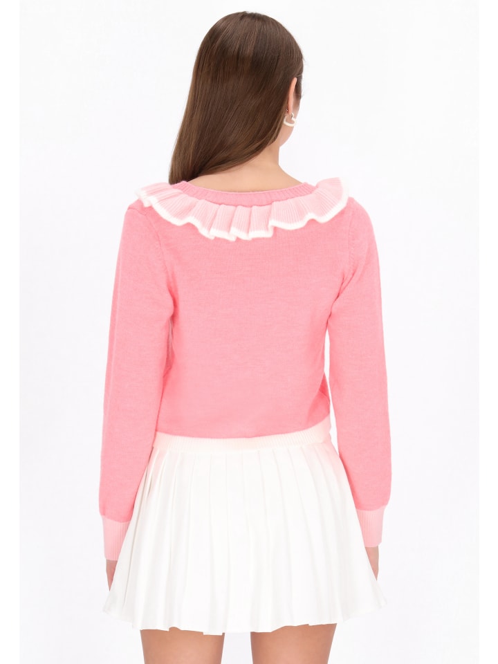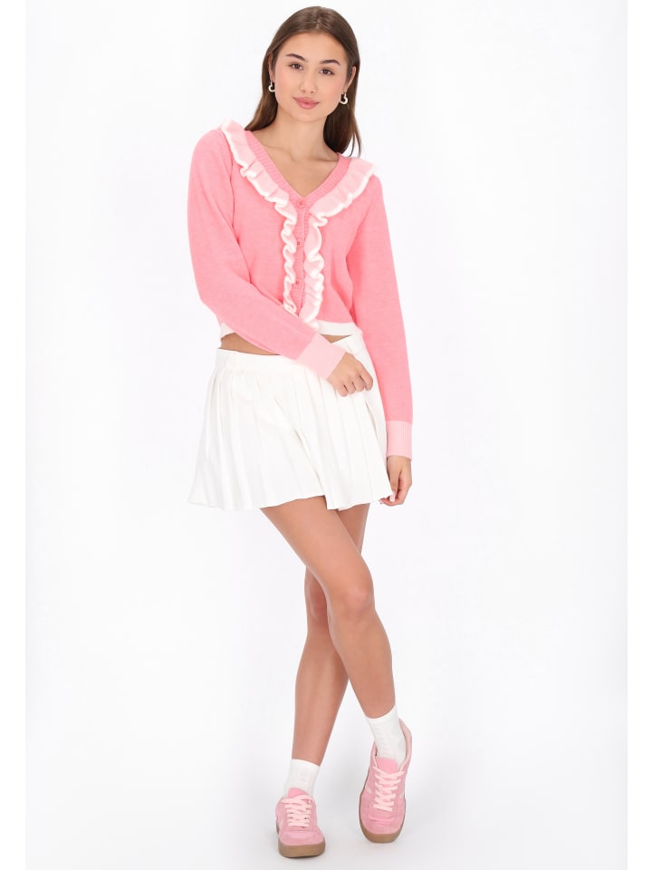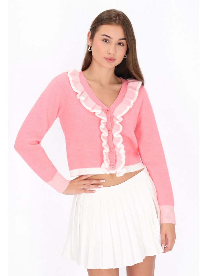 Добавьте женственности в свой школьный гардероб с этим кардиганом прямого кроя из коллекции MyMo Pop. Кардиган с развевающимся V-образным вырезом и длинными рукавами застегивается спереди на пуговицы, украшен изящными оборками и контрастной отделкой, создавая очаровательный акцент. Этот удобный кардиган из мягкого трикотажа с классическим однотонным узором сочетает в себе непринужденную элегантность и молодежный стиль - идеально подходит для создания многослойного образа в прохладные дни или для создания стильного повседневного образа.