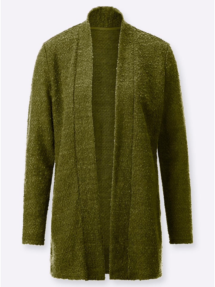 При виде этого кардигана вам захочется укутаться в его потрясающую ткань букле! Модный удлиненный силуэт красиво удлиняет фигуру. Кардиган имеет эффектный открытый крой с шалевым воротником, длинными рукавами и боковыми разрезами.