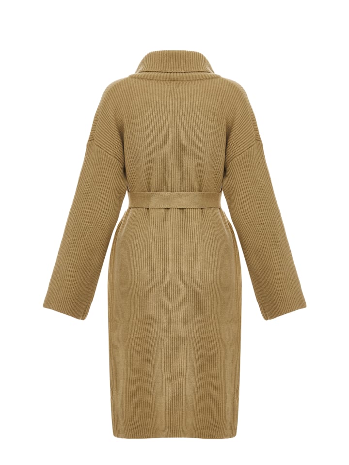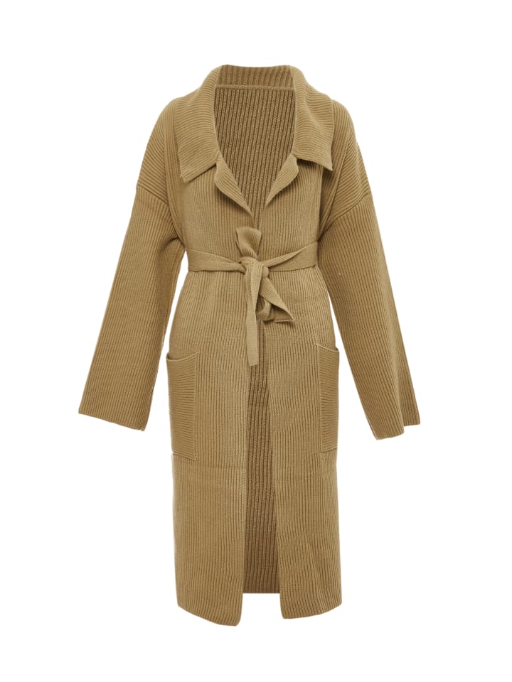 Украсьте свой гардероб этим трикотажным изделием, которое излучает изысканность и комфорт. Ребристая текстура, отложной воротник, напоминающий лацканы, и пояс на талии делают эту модель стильной и практичной. Длинные рукава и средняя длина обеспечивают тепло и защиту в прохладную погоду. Эта модель, разработанная совместно с RISA, сочетает в себе классический стиль и современный дизайн.