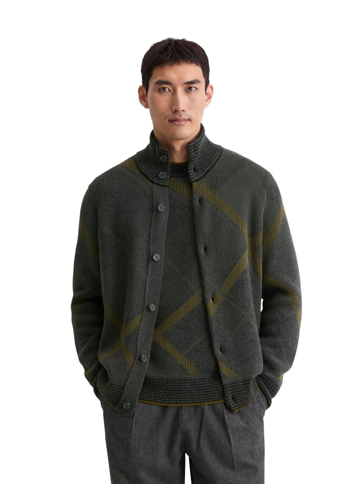 Кардиган с современной интерпретацией ромбовидного узора в захватывающем сочетании цветов и фактур вязки. Мягкая смесь натуральной шерсти, хлопка и полиамида обеспечивает исключительный комфорт и сохраняет форму. Высокий воротник-стойка, планка с пуговицами по всей длине, а также ребристые манжеты и низ. Классический крой обеспечивает современный силуэт. Носите его расстегнутым для спортивного образа или застегнутым для эффектного акцента - универсальный трикотажный предмет со стильным внешним видом.