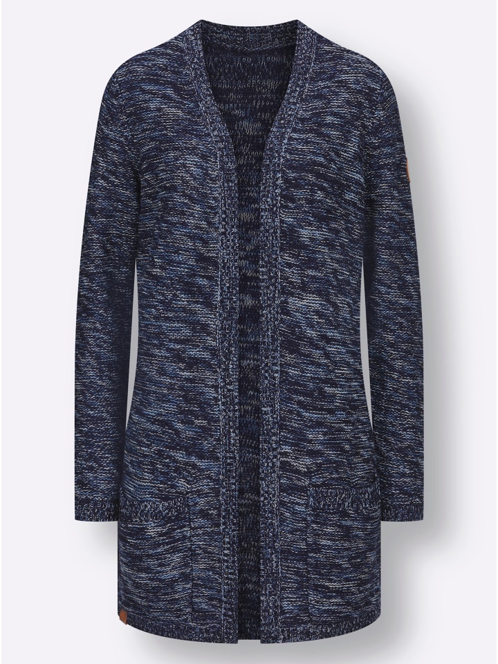 Красивый узор изнаночной вязки и удлиненный фасон делают этот меланжевый кардиган фаворитом! Современный дизайн с открытым передом выгодно подчеркивает фигуру. Ребристая отделка на легком V-образном вырезе, длинных рукавах и подоле. Практичный дизайн: два накладных кармана. Высококачественный фасонный трикотаж. Соответствует инициативе «Хлопок, сделанный в Африке».