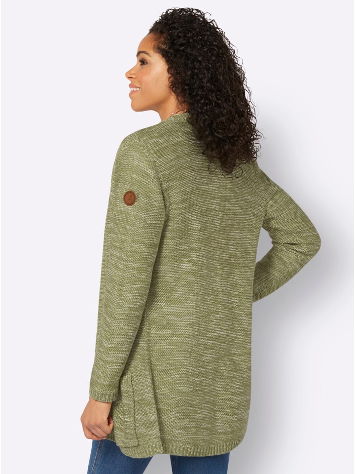 Красивый узор изнаночной вязки и удлиненный фасон делают этот меланжевый кардиган фаворитом! Современный дизайн с открытым передом выгодно подчеркивает фигуру. Ребристая отделка на легком V-образном вырезе, длинных рукавах и подоле. Практичный дизайн: два накладных кармана. Высококачественный фасонный трикотаж. Соответствует инициативе «Хлопок, сделанный в Африке».