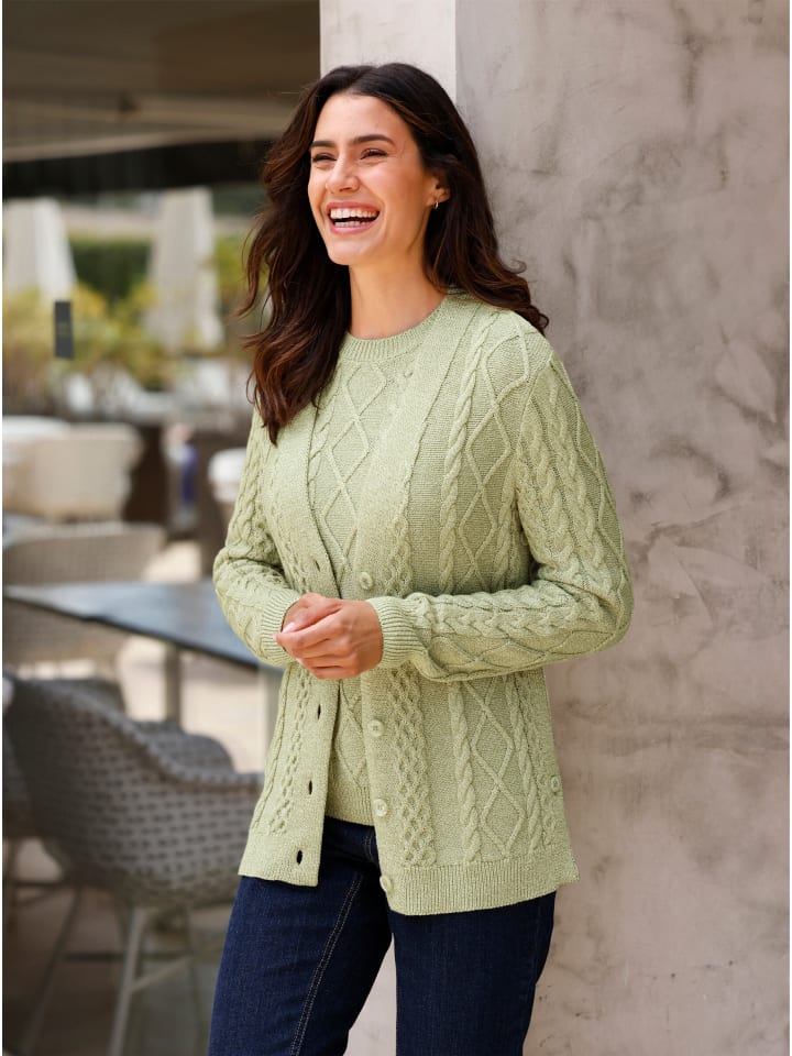 Наденьте его и почувствуйте уют: этот пушистый кардиган с замысловатым сочетанием вязаных узоров всегда готов к уютному стилю. Он имеет V-образный вырез и планку с пуговицами. Боковые панели с высокими застежками на пуговицы связаны из гладкой ткани. Эластичные манжеты на длинных рукавах и резинка по низу завершают образ. Сертифицировано OCS.