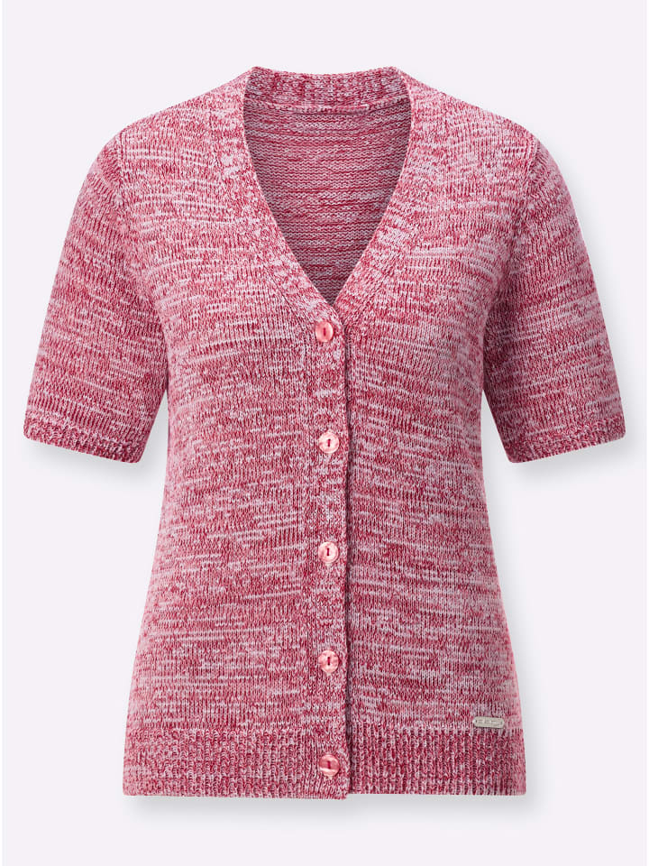 Этот кардиган выглядит великолепно благодаря ленточной пряже с меланжевым эффектом, не требующей особого ухода. Он имеет V-образный вырез, застежку на пуговицы и резинку на коротких рукавах и подоле. Высококачественная фасонная вязка.