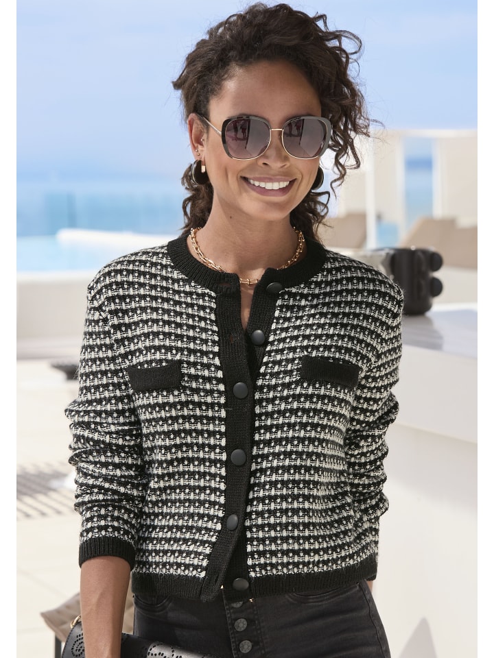 Кардиган с узором от Lascana. Круглый вырез и застежка на пуговицы по всей длине. Длинные рукава. Декоративные карманы спереди. Короткий и прямой фасон. Мягкий трикотаж.