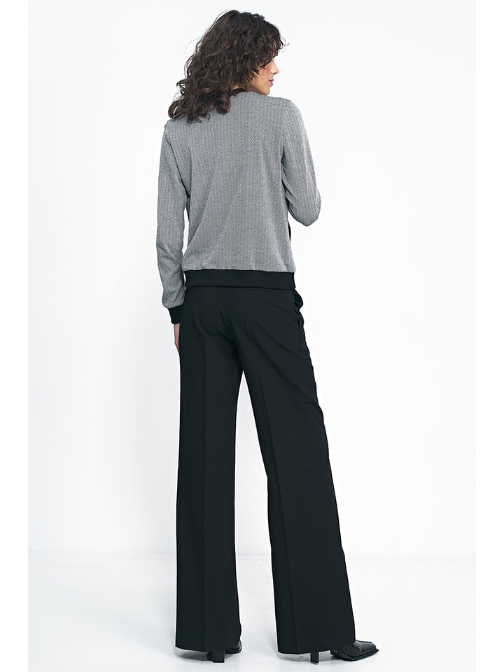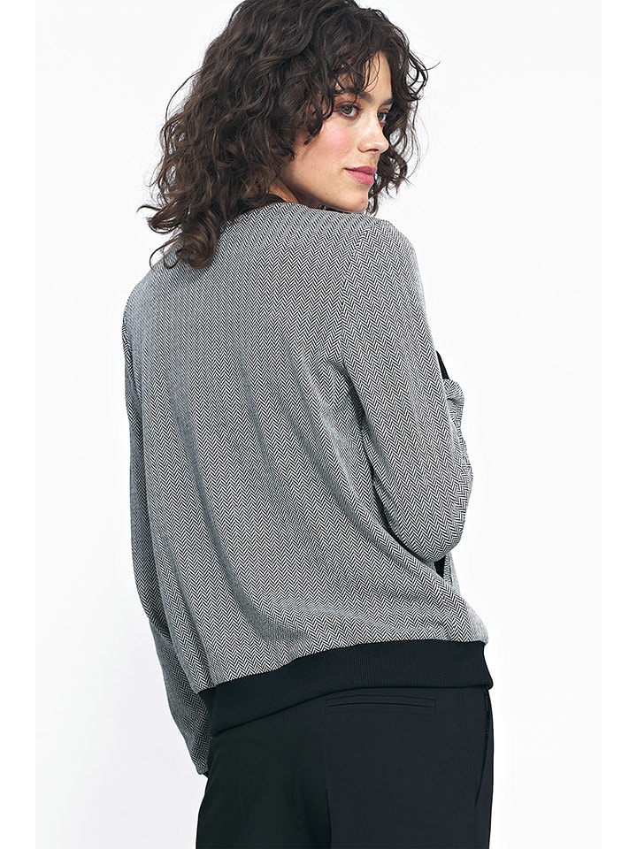 - Ребристая вязка: Вырез горловины, манжеты, подол