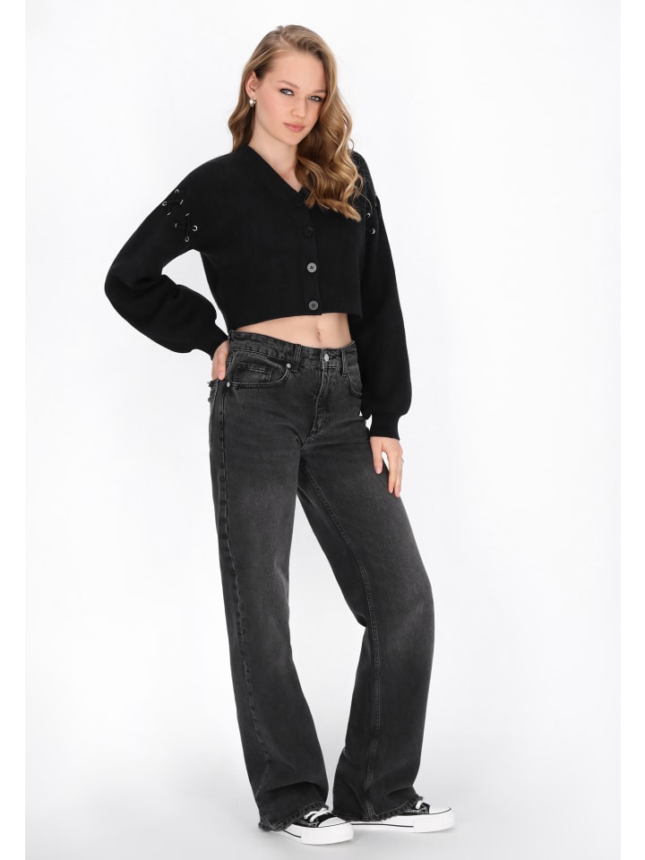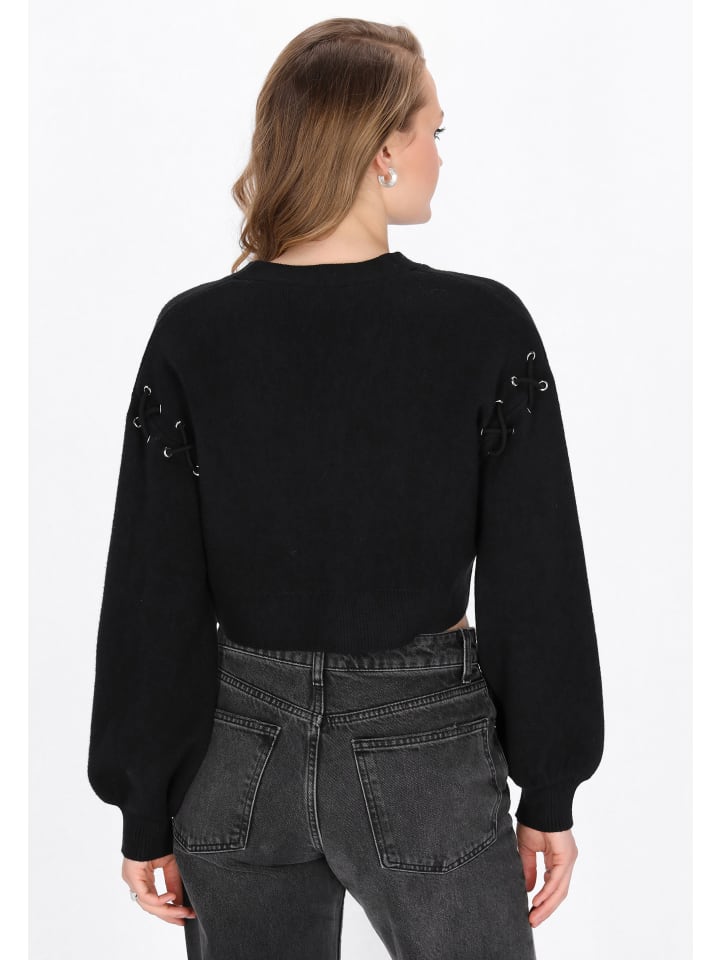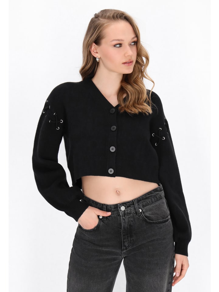Откройте для себя модный укороченный кардиган из коллекции Mymo Rock. Свободный крой, округлый вырез и застежка на пуговицы спереди создают непринужденный образ. Длинные рукава-бишоп украшены декоративной шнуровкой, а трикотаж обеспечивает комфорт. Идеально сочетается с джинсами с высокой талией, создавая стильный и элегантный образ!