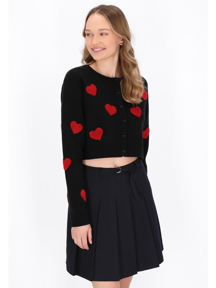 Этот короткий кардиган - идеальное сочетание девичьего очарования и повседневного комфорта. Он изготовлен из мягкого трикотажа и впечатляет романтичным узором в виде сердечек и декоративными пуговицами, которые добавляют ему неповторимый штрих. Классический крой, круглый вырез горловины и длинные рукава делают его идеальным как для повседневных, так и для более стильных образов. Незаменимая вещь