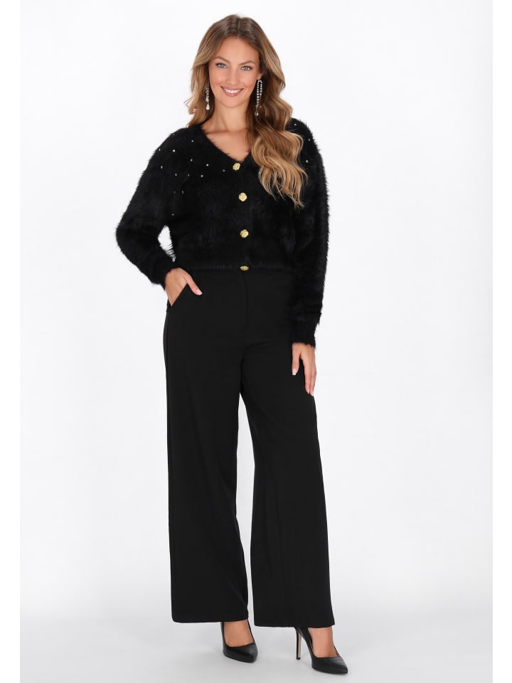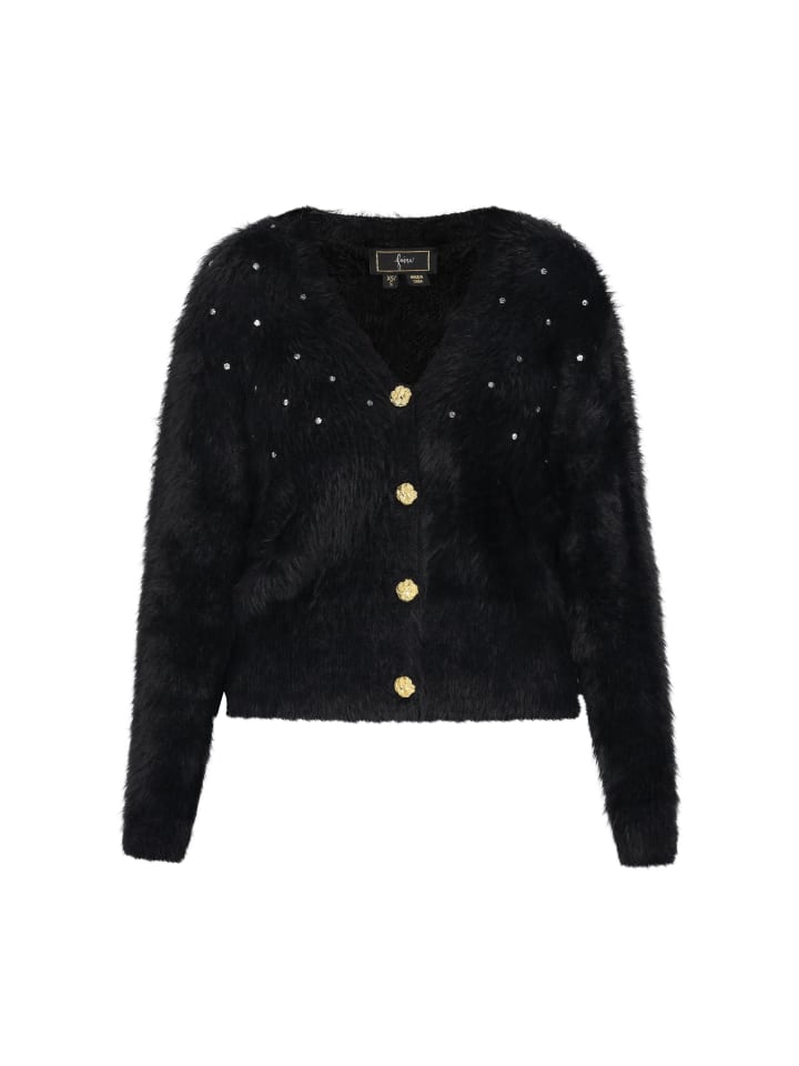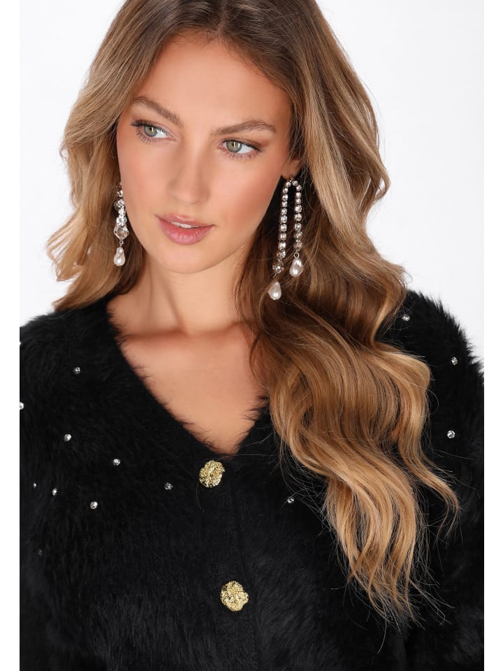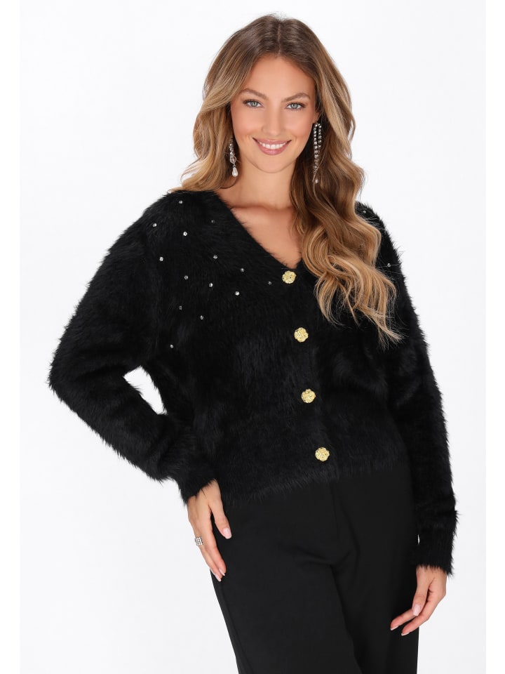 Этот стильный и удобный кардиган из коллекции Fashion Look станет идеальным дополнением к повседневным нарядам. Изготовленный из мягкого трикотажа, он обеспечивает приятное тепло и комфорт. Свободный крой, длинные рукава и V-образный вырез создают непринужденный, но женственный силуэт. Декоративная застежка на пуговицы и отделка сверкающими стразами спереди добавляют элегантности, которая отличает эту модель от классических свитеров. Мягкий узор делает этот кардиган универсальным выбором для самых разных нарядов - от джинсов до юбок. Идеальный выбор для прохладных дней - уютный, стильный и с легким блеском.