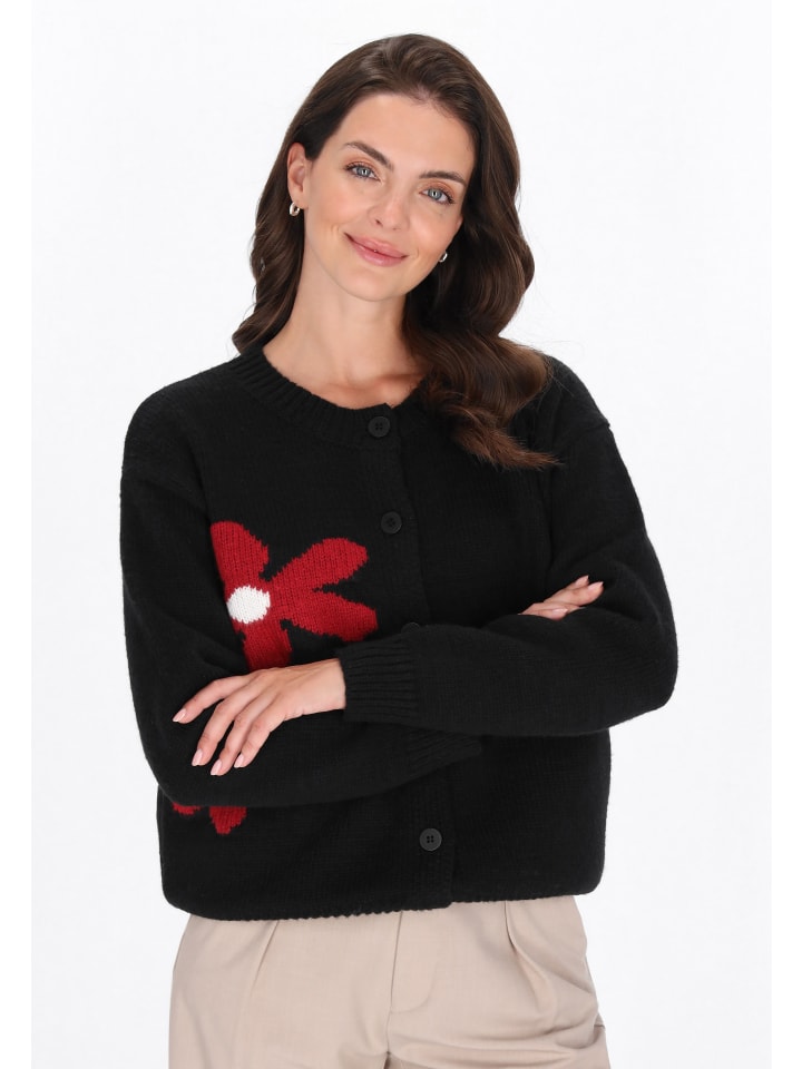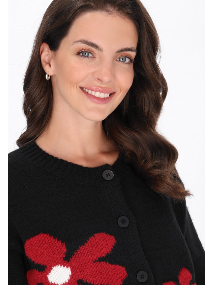 Этот кардиган из коллекции Fashion Look - стильный и удобный вариант на каждый день. Изготовленный из мягкого трикотажа с цветочным узором, он подкупает своим уютом и модным дизайном. Свободный крой со спущенной линией плеча и длинными рукавами гарантирует свободу движений и комфорт. Классический круглый вырез и застежка на пуговицы добавляют универсальности, делая его идеальным как для повседневных, так и для более женственных образов.