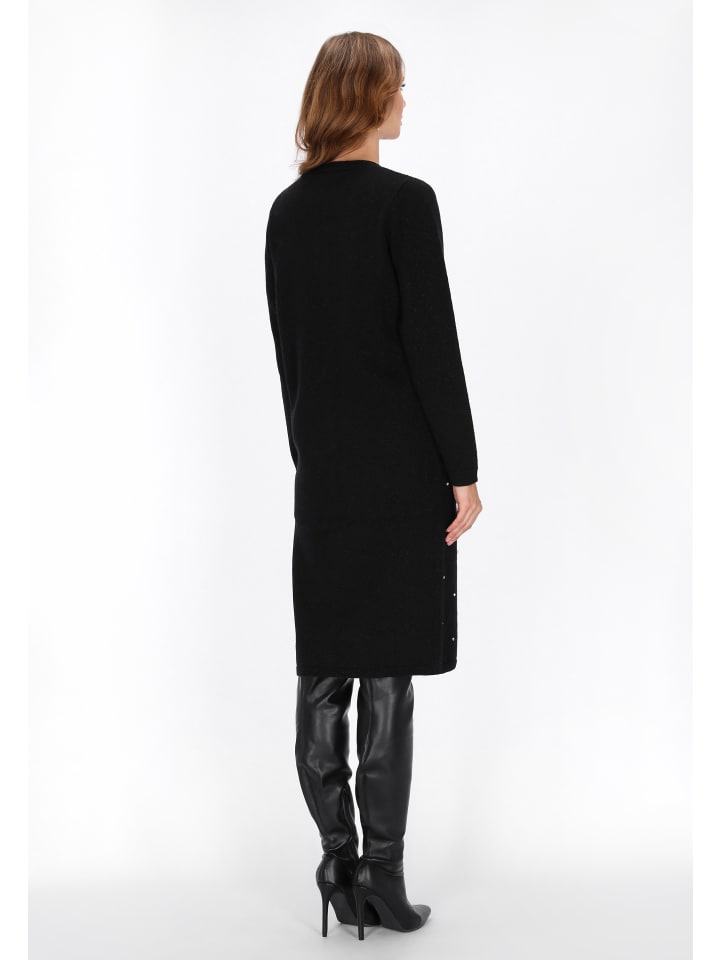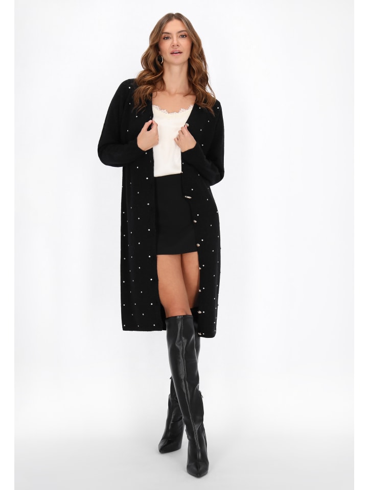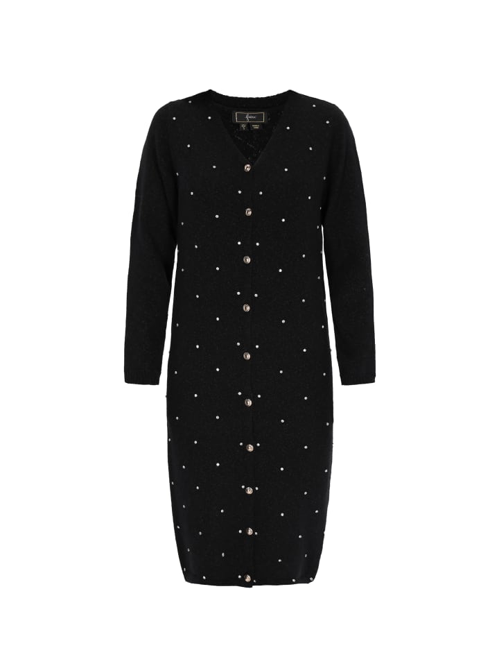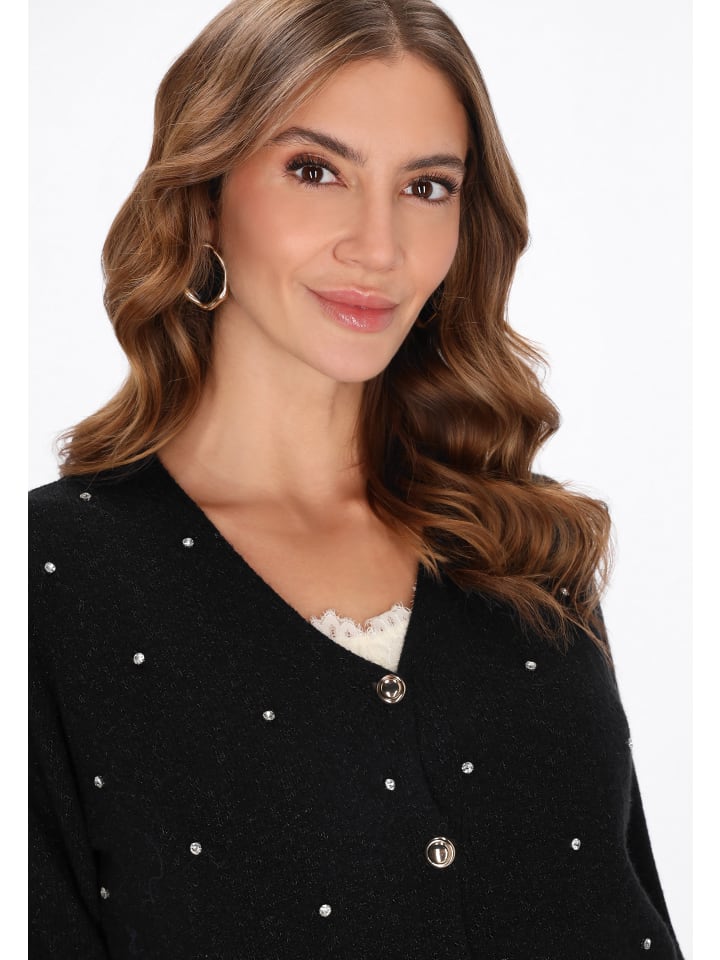 Этот длинный кардиган с V-образным вырезом - идеальное сочетание комфорта и стиля. Изготовленный из мягкой трикотажной ткани, он обеспечивает комфорт и уют на каждый день. Длинные рукава и застежка на пуговицы добавляют классический штрих, а изящные элементы из сверкающих нитей и стразов создают яркий, мерцающий узор, который добавляет модный и элегантный вид. Этот кардиган из коллекции Fashion Look идеально подходит для повседневных и модных образов.