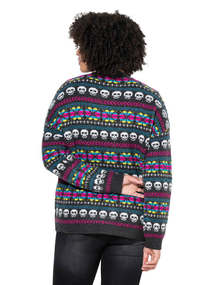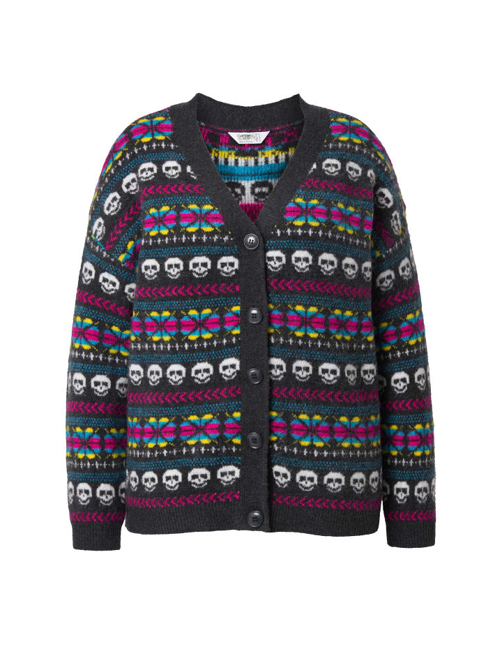 Слегка свободный кардиган из мягкой тонкой пряжи с разноцветными черепами. V-образный вырез, спущенная линия плеча, планка на пуговицах. Широкие рукава-фонарики.