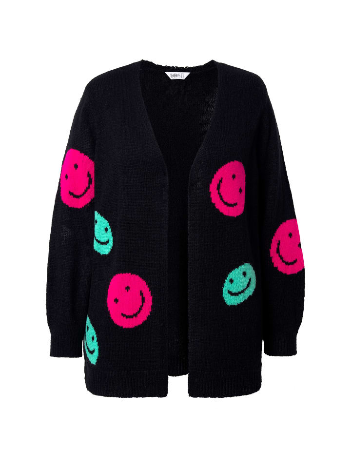 Кардиган прямого кроя свободной вязки с рисунком в виде смайликов. Свободный, расклешенный кардиган с V-образным вырезом и длинными рукавами-фонариками.
