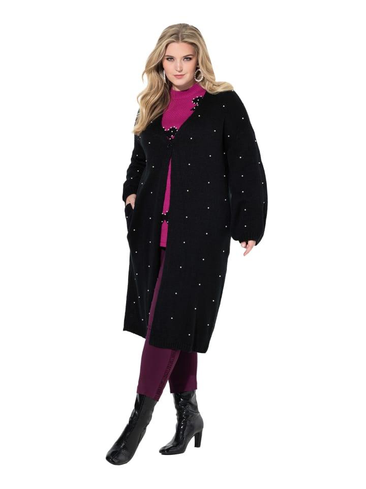 Длинный кардиган, удлиненный, удобного кроя, из мягкой тонкой вязки с декоративными бусинами. V-образный вырез, застежка на пуговицы, 2 кармана. Широкие рукава-баллоны с ребристыми манжетами.