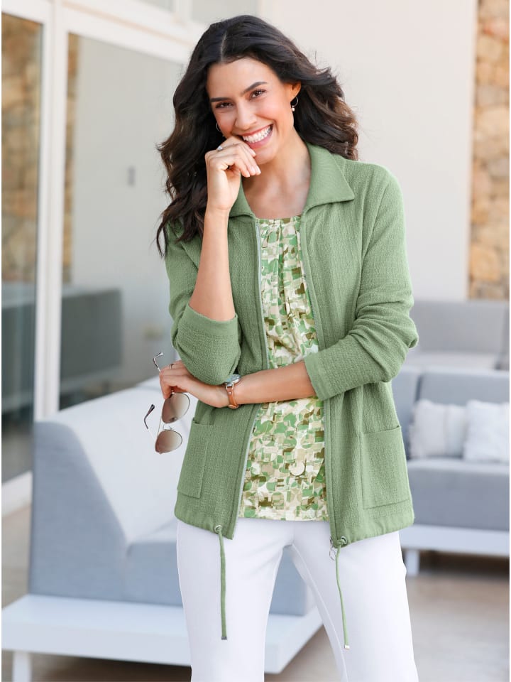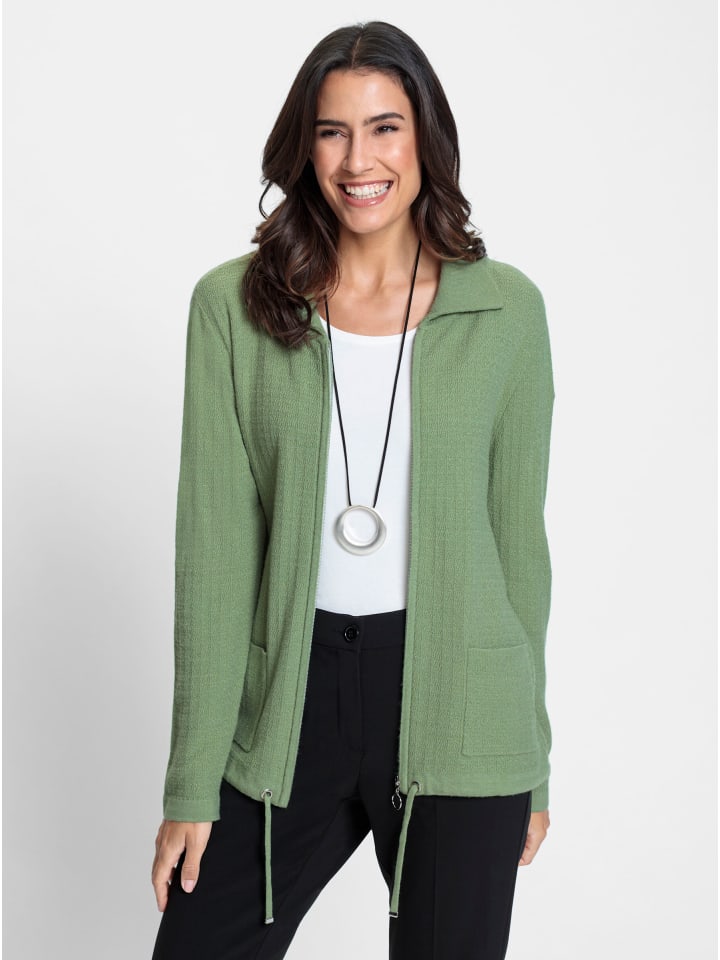 Кардиган с уникальным узором из фактурной и ажурной вязки. Струящаяся и легкая в уходе ткань. Прямой крой с воротником-поло, застежкой-молнией и двумя накладными карманами. Регулируемый подол с кулиской.