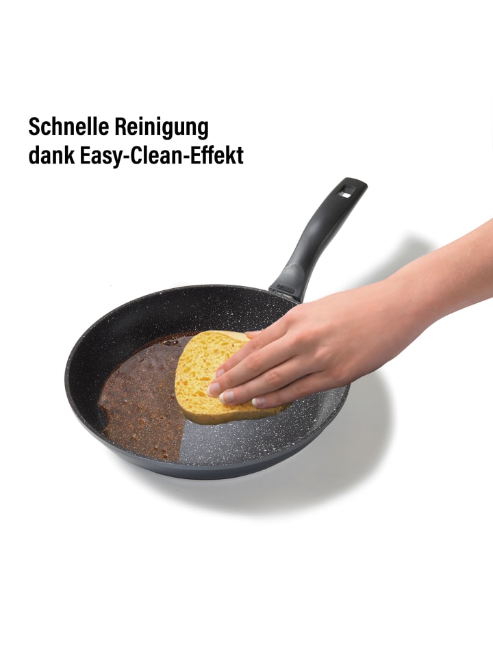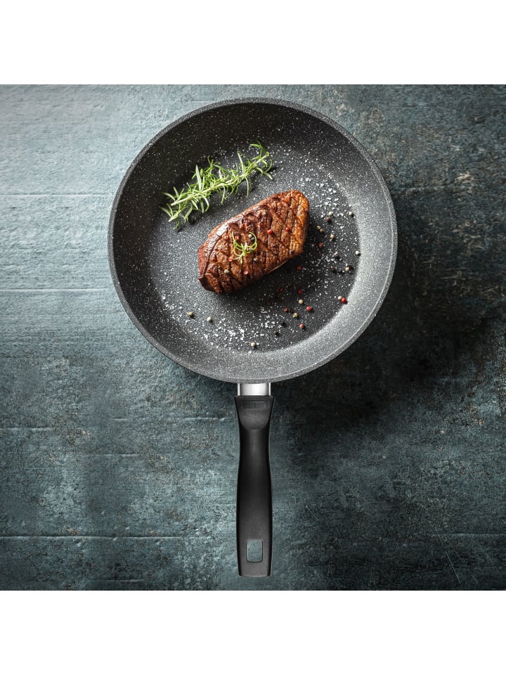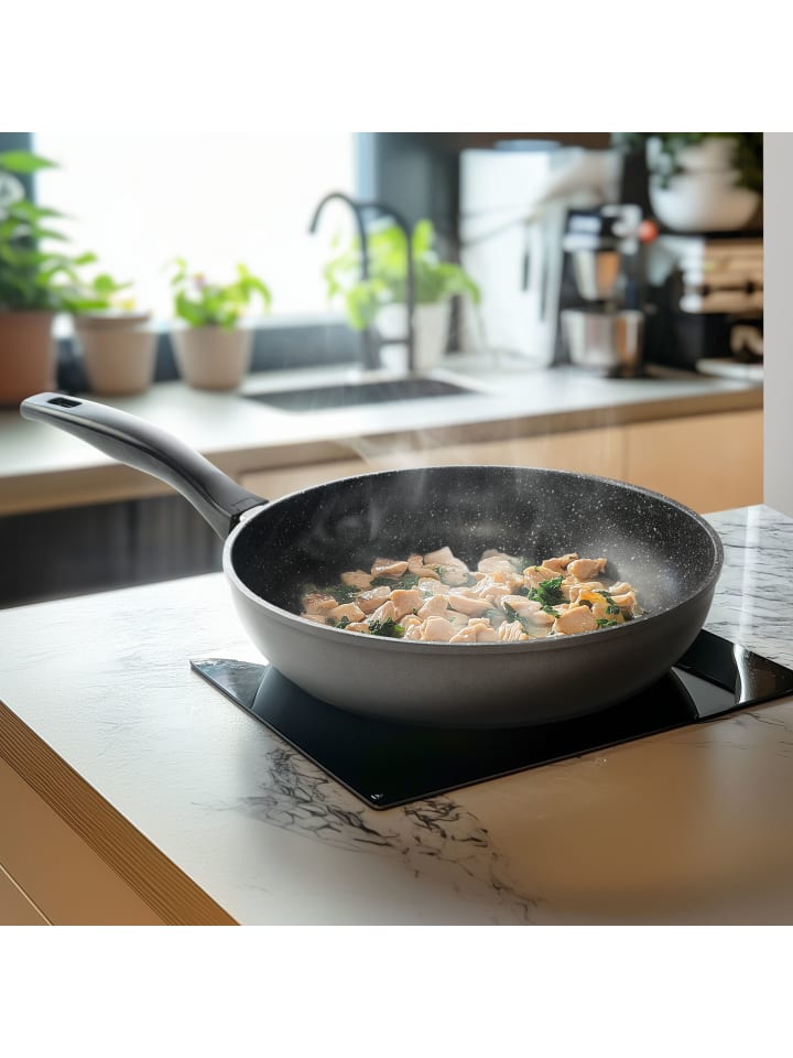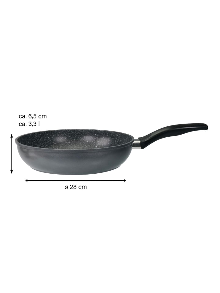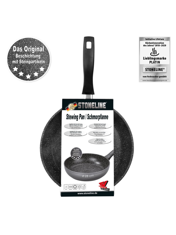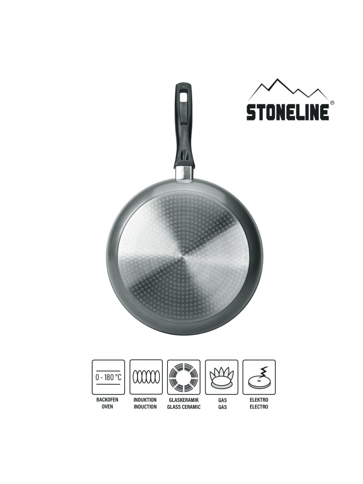 Эта сковорода идеально подходит для жарки и тушения любых блюд! Благодаря специальному антипригарному покрытию STONELINE вы можете готовить еду - с жиром и маслом или без них - так, как вам нравится, и она будет отделяться от посуды, не прилипая. Неважно, готовите ли вы на стеклокерамической, индукционной, электрической или газовой плите. Благодаря оригинальному покрытию STONELINE к посуде не прилипают стойкие остатки пищи, а легкая ручная мойка экономит ваше время и силы. Краткий обзор важнейших преимуществ посуды STONELINE: Единственное в мире антипригарное покрытие с настоящими каменными частицами; устойчивое к царапинам антипригарное покрытие STONELINE; сохранение витаминов при приготовлении и жарке без жира и масла; оптимальные результаты жарки и хрустящее мясо; также подходит для вегетарианцев: овощи остаются хрустящими и сочными; ничего не пригорает и не прилипает; очень легко мыть; Сверхпрочное, недеформируемое дно; толщина дна: 4,5 см².