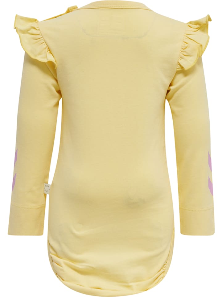 Комбинезон hmlMIRABEL BODY L/S из эластичного хлопкового трикотажа станет прекрасным дополнением к гардеробу вашего ребенка. Этот комбинезон Hummel украшен оборками на плечах и контрастным принтом логотипа Bumblebee спереди. Материал сертифицирован по стандарту OEKO-TEX STANDARD 100 и не содержит вредных веществ.