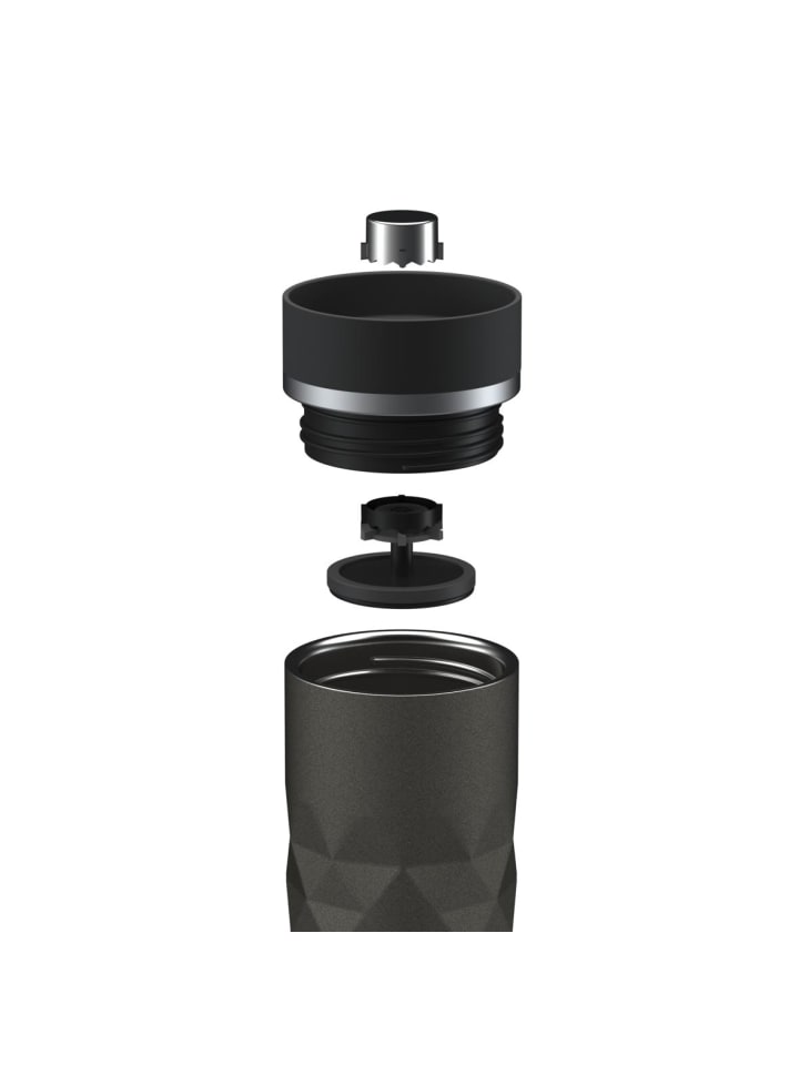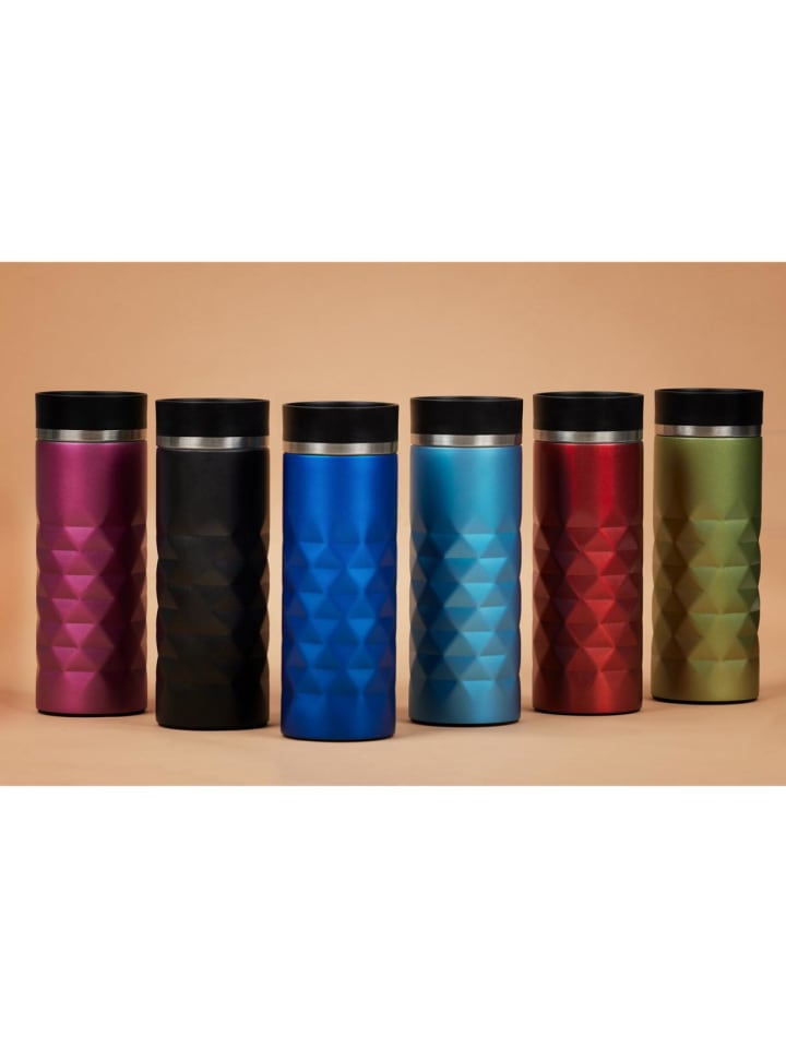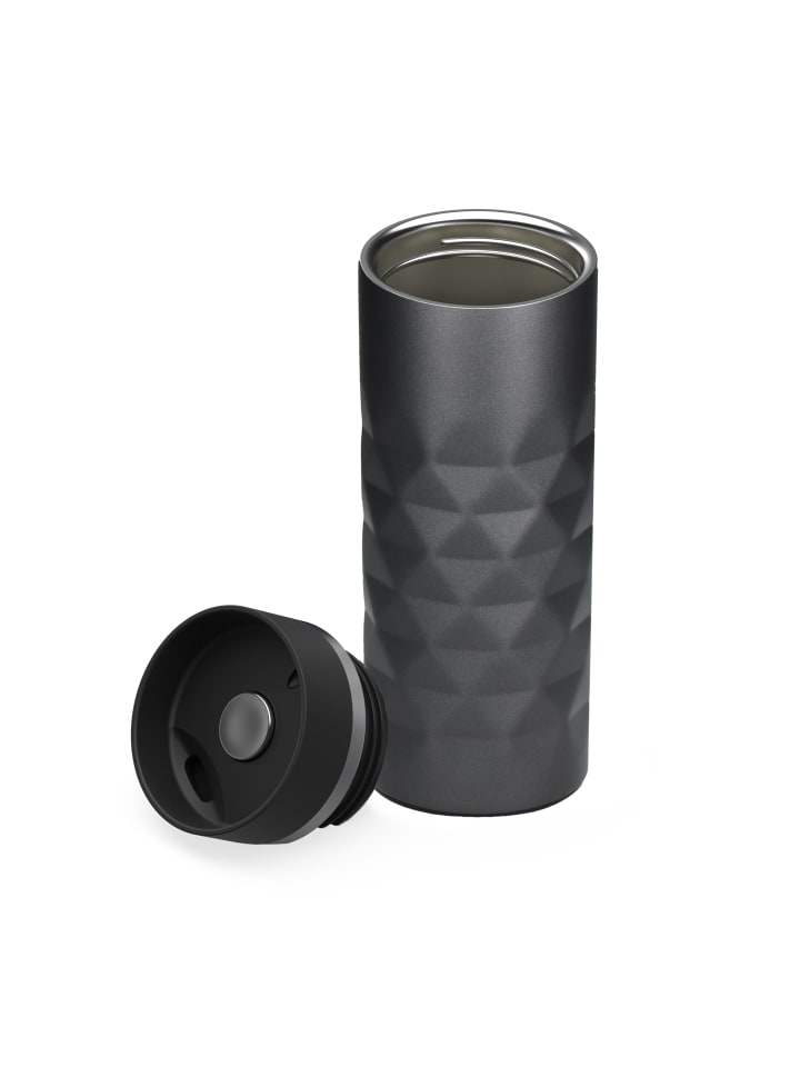 Высококачественная термокружка с матовым ромбовидным узором и блестящим эффектом. Двойные стенки кружки из нержавеющей стали с вакуумной изоляцией оснащены крышкой с кнопкой для легкого открывания и закрывания носика для питья одной рукой. Прорезиненное основание обеспечивает надежный захват даже на гладких поверхностях и защищает поверхности от царапин. Объем: 0,45 литра.