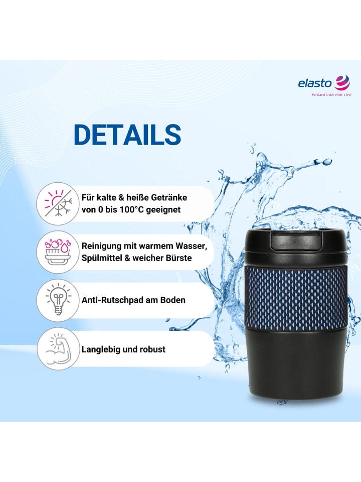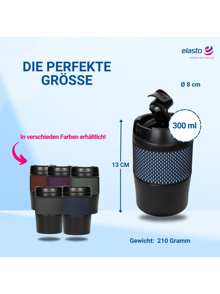 Серый силиконовый чехол не только обеспечивает надежный захват, но и придает кружке современный вид. Эта кружка объемом около 0,3 литра идеально подходит для путешествий или повседневного использования дома или в офисе.