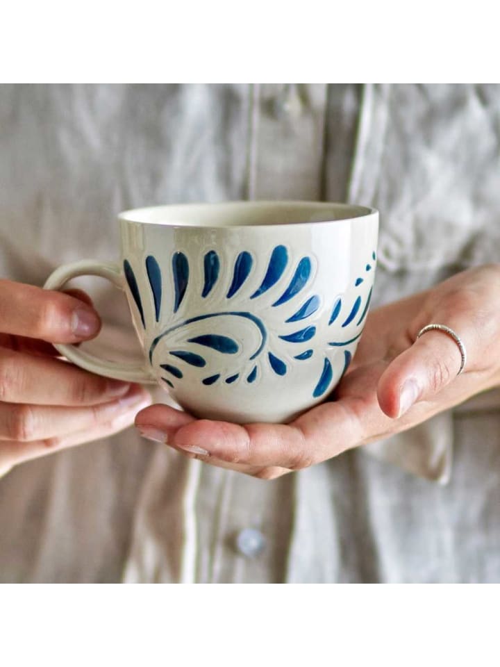 Эта кружка в блестящем белом цвете придаст вашим столовым приборам вневременную элегантность. Но настоящее волшебство кроется в рельефном узоре яркого синего цвета, который не только украшает поверхность, но и рассказывает историю. Каждая кружка уникальна, изготовлена вручную с вниманием к деталям.