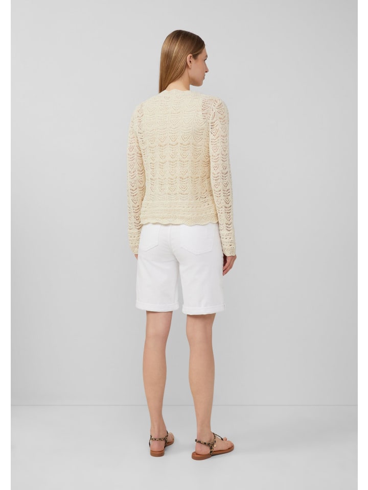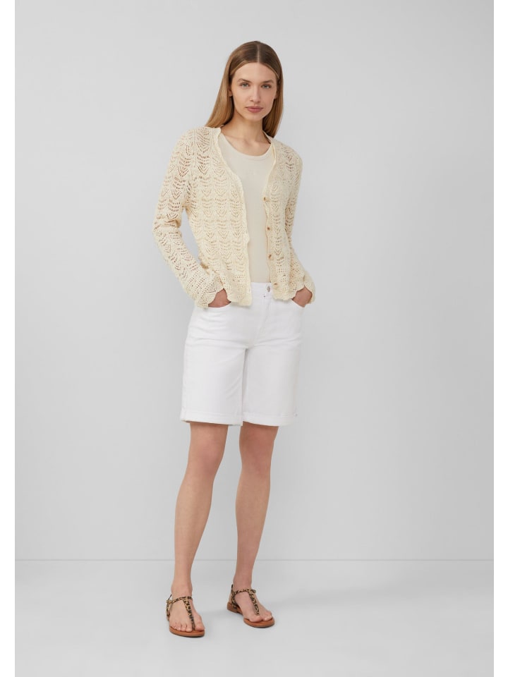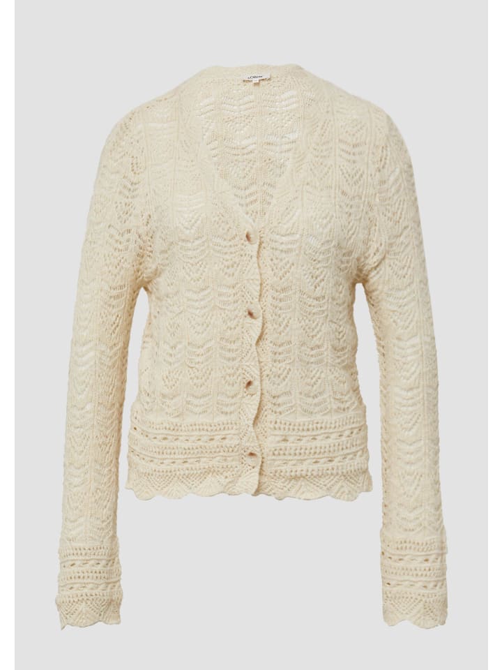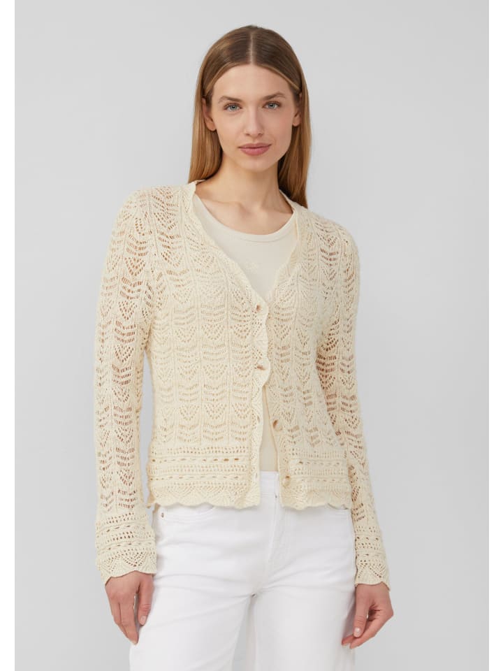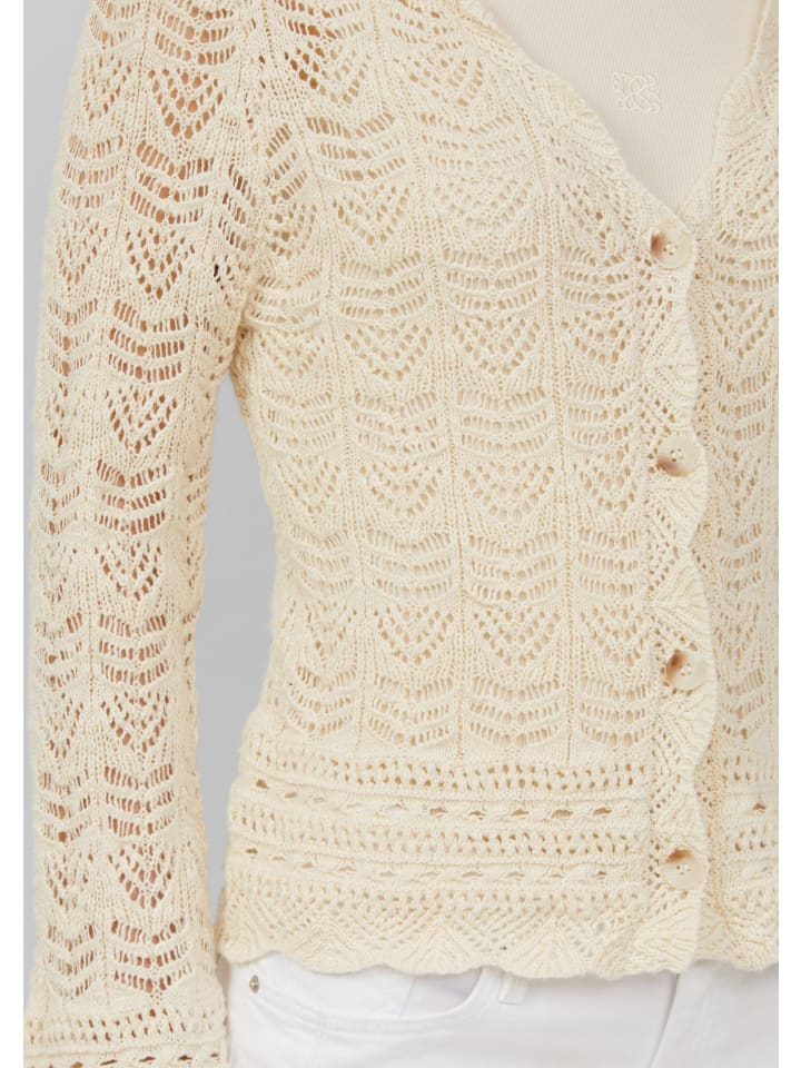 Этот воздушный и легкий кардиган с V-образным вырезом создает женственный образ. Нежный ажурный вязаный узор и фестончатый край добавляют элегантные акценты. Планка с пуговицами делает его идеальным дополнением для расслабленных моментов.