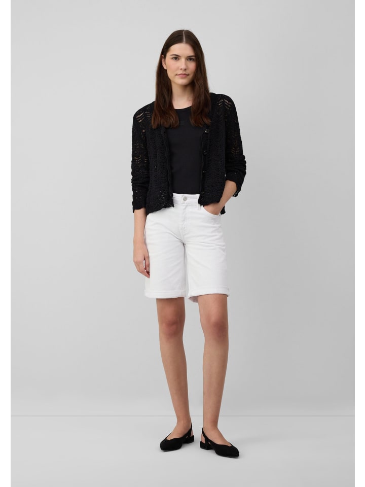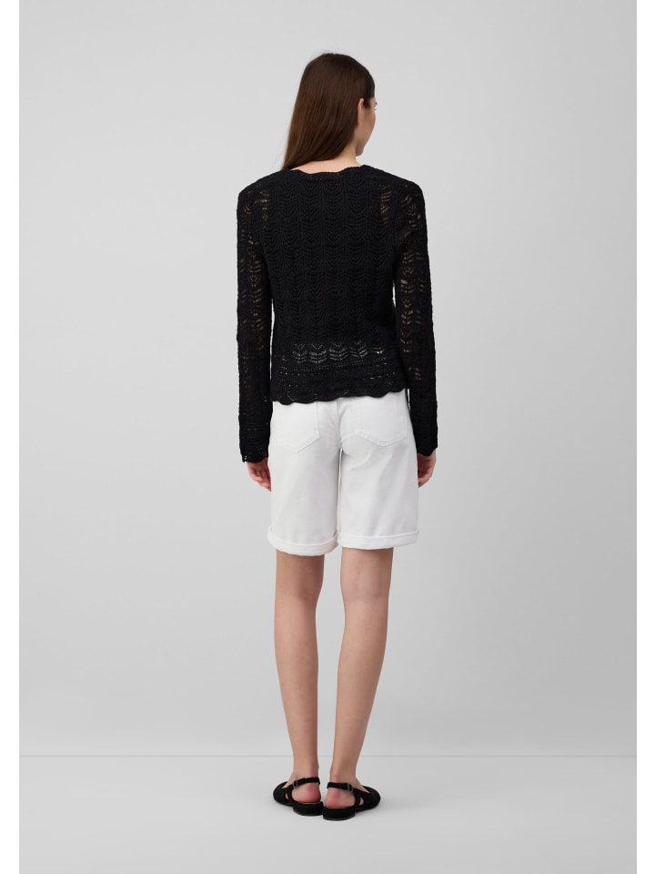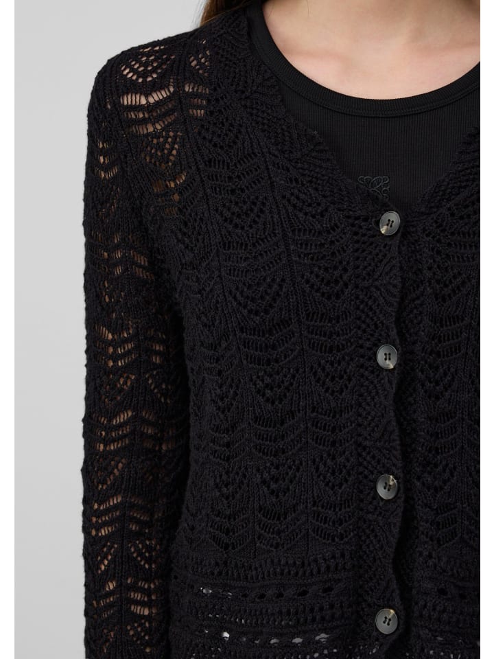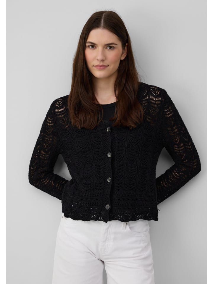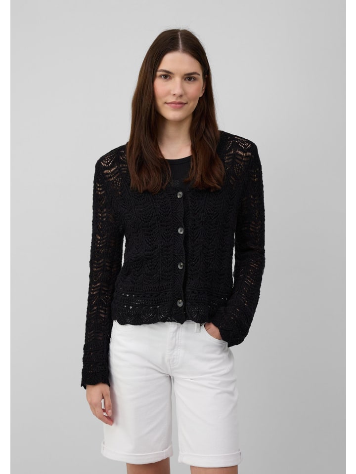 Этот воздушный и легкий кардиган с V-образным вырезом создает женственный образ. Нежный ажурный вязаный узор и фестончатый край добавляют элегантные акценты. Планка с пуговицами делает его идеальным дополнением для расслабленных моментов.
