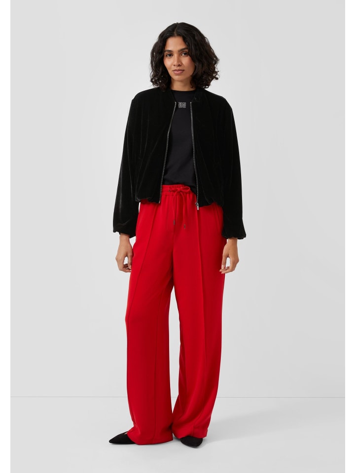 Этот струящийся бархатный блузон свободного кроя станет вашим новым спутником для неспешного отдыха. Стильный воротник-бомбер, практичные прорезные карманы и высококачественная подкладка сочетают в себе комфорт и элегантность. Спущенная линия плеча придает модели непринужденный вид.
