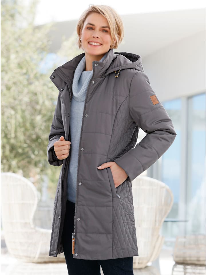 Вам будет тепло и уютно в холодные дни! Длинная куртка с воротником-стойкой и съемным капюшоном. Удлиненный крой и боковые стежки создают привлекательный силуэт. Потайная молния с планкой на кнопках. Эластичные манжеты и внутренние ветрозащитные планки на рукавах. Прорезные карманы на молнии, один внутренний карман на пуговице. Боковые разрезы на молнии обеспечивают полную свободу движений. Приталенные швы спереди и сзади обеспечивают оптимальную посадку. Изготовлено из переработанного полиэстера.