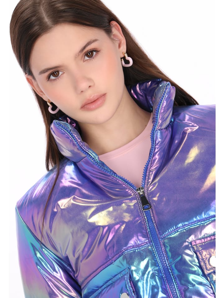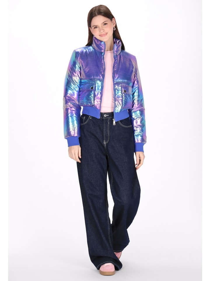 Эта стильная куртка - настоящий маст-хэв для поклонников современной уличной моды. Изготовленная из высококачественного полиэстера с эффектным голографическим узором, она привлекает внимание и добавляет футуристический штрих. Классический крой и укороченная длина подчеркивают силуэт, а воротник-стойка и застежка на молнию добавляют спортивный штрих. Длинные рукава, ребристый пояс и манжеты обеспечивают комфорт и идеальную посадку. Два кармана с клапанами добавляют практичности и подчеркивают городской стиль. Отличный выбор для тех, кто ценит комфорт, молодежный стиль и модный образ.