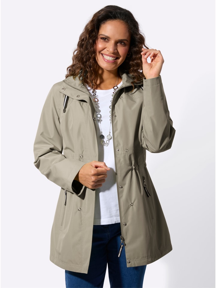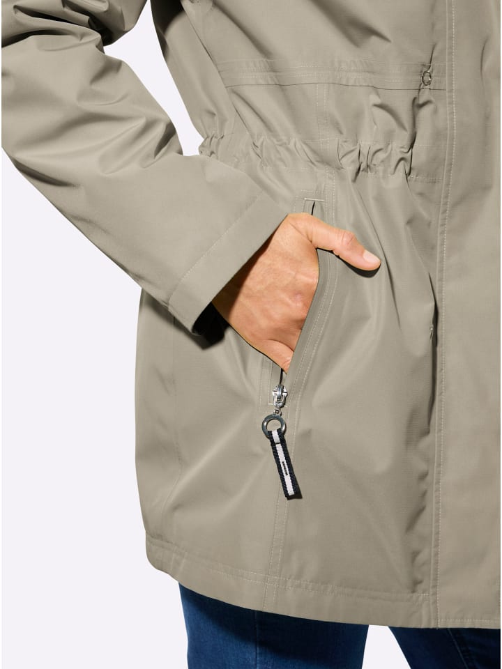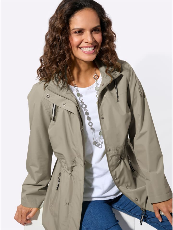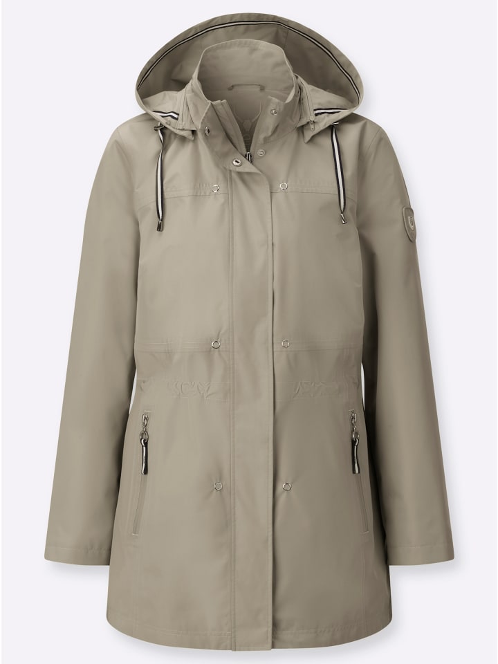 Идеально подходит для межсезонья: спортивная, ветро- и водонепроницаемая функциональная куртка из переработанного полиэстера. Капюшон на воротнике-стойке легко отстегивается. Молния во всю длину скрыта планкой на кнопках. Имеет внутренний шнурок на талии, практичные карманы на молнии и один внутренний карман на пуговице. Длинные рукава. Швы обеспечивают хорошую посадку. Детальная обработка с контрастной отделкой, люверсами и декоративной строчкой.