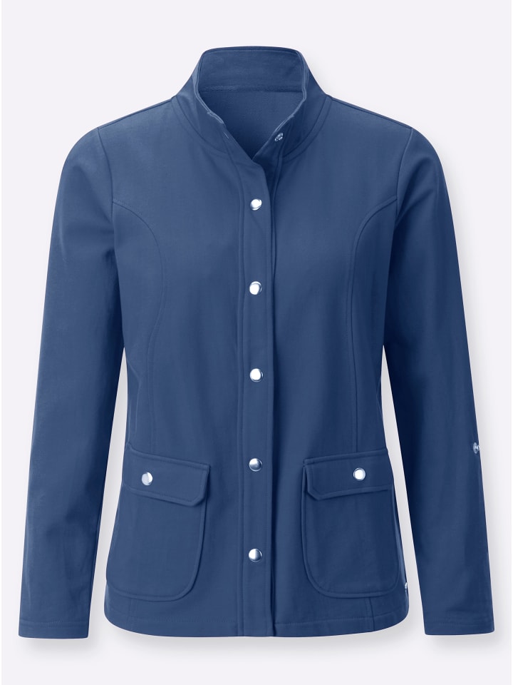 Очень удобная! Спортивная куртка-рубашка с воротником-стойкой, серебристыми кнопками, длинными закатанными рукавами и накладными карманами на кнопках. Ажурные швы обеспечивают отличную посадку. Сертифицировано GOTS.