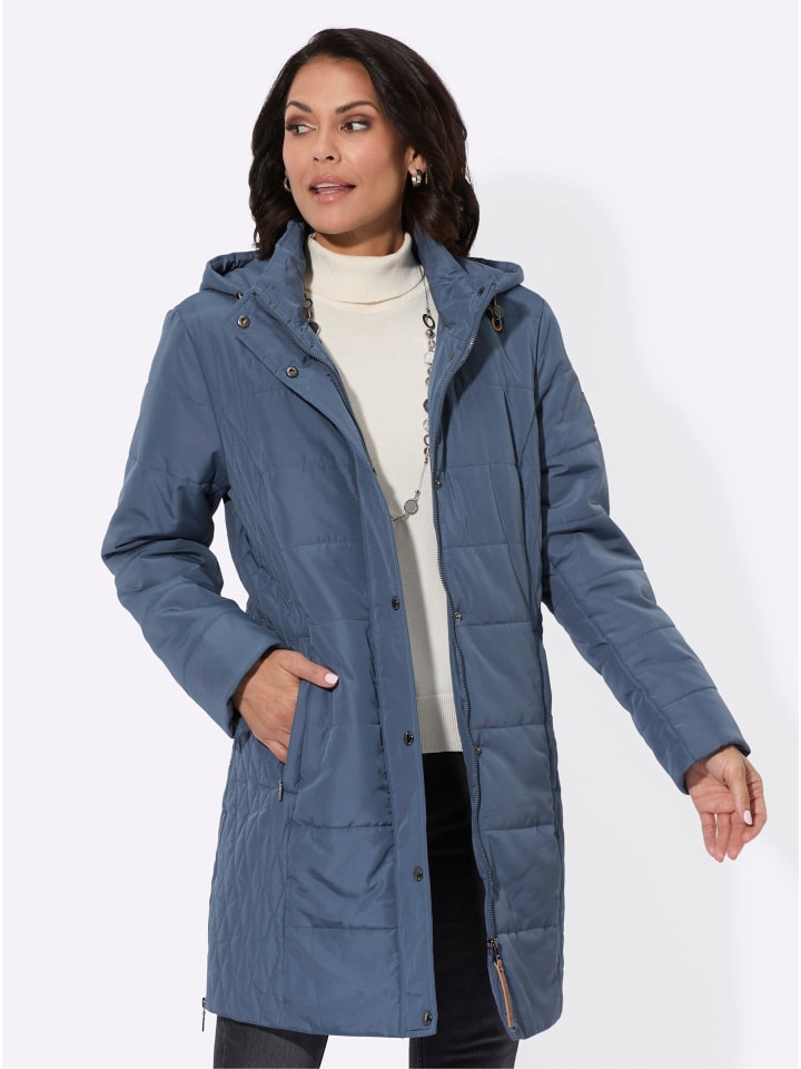 Вам будет тепло и уютно в холодные дни! Длинная куртка с воротником-стойкой и съемным капюшоном. Удлиненный крой и боковые стежки создают привлекательный силуэт. Потайная молния с планкой на кнопках. Эластичные манжеты и внутренние ветрозащитные планки на рукавах. Прорезные карманы на молнии, один внутренний карман на пуговице. Боковые разрезы на молнии обеспечивают полную свободу движений. Приталенные швы спереди и сзади обеспечивают оптимальную посадку. Изготовлено из переработанного полиэстера.
