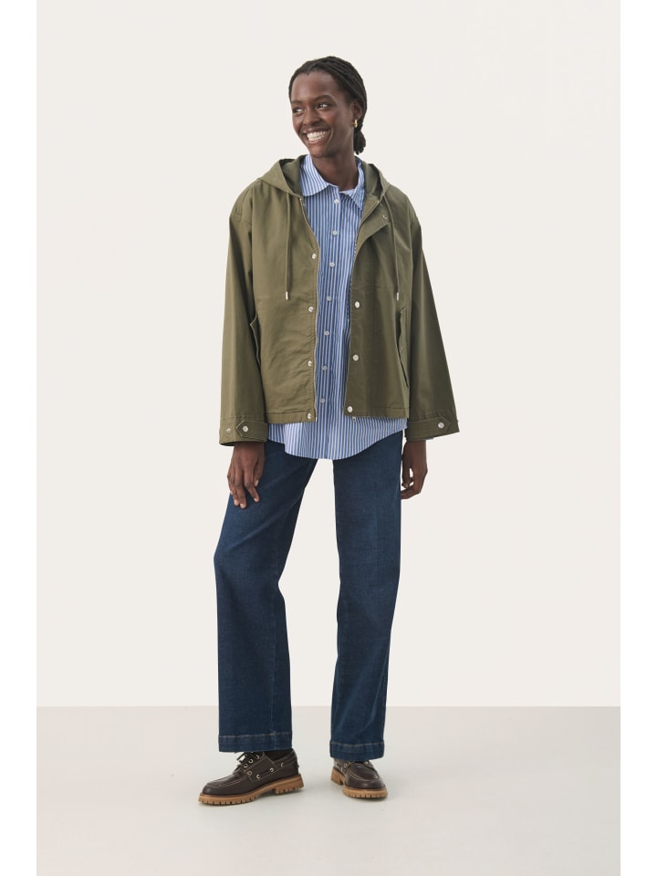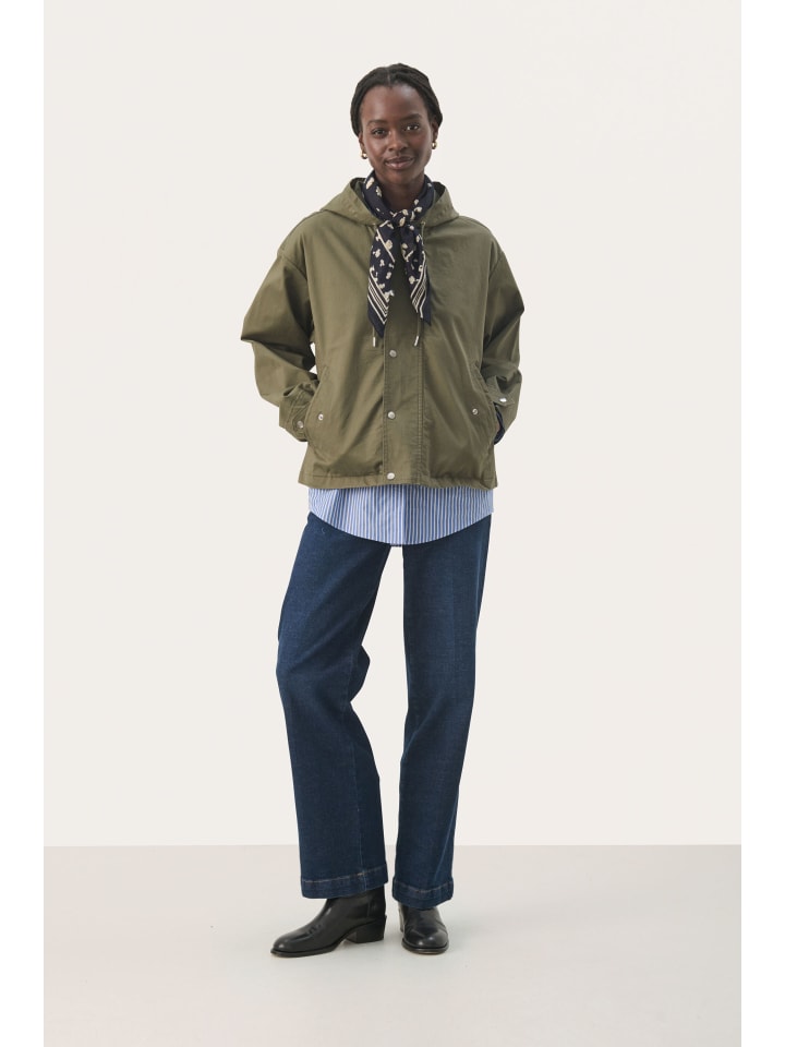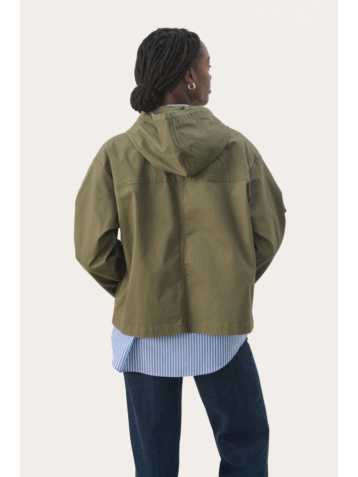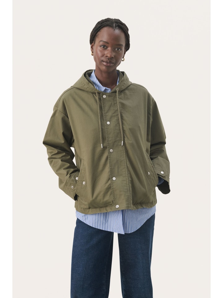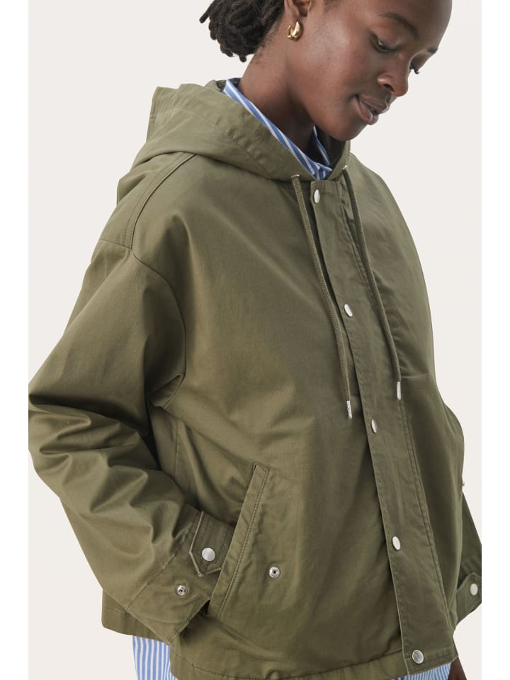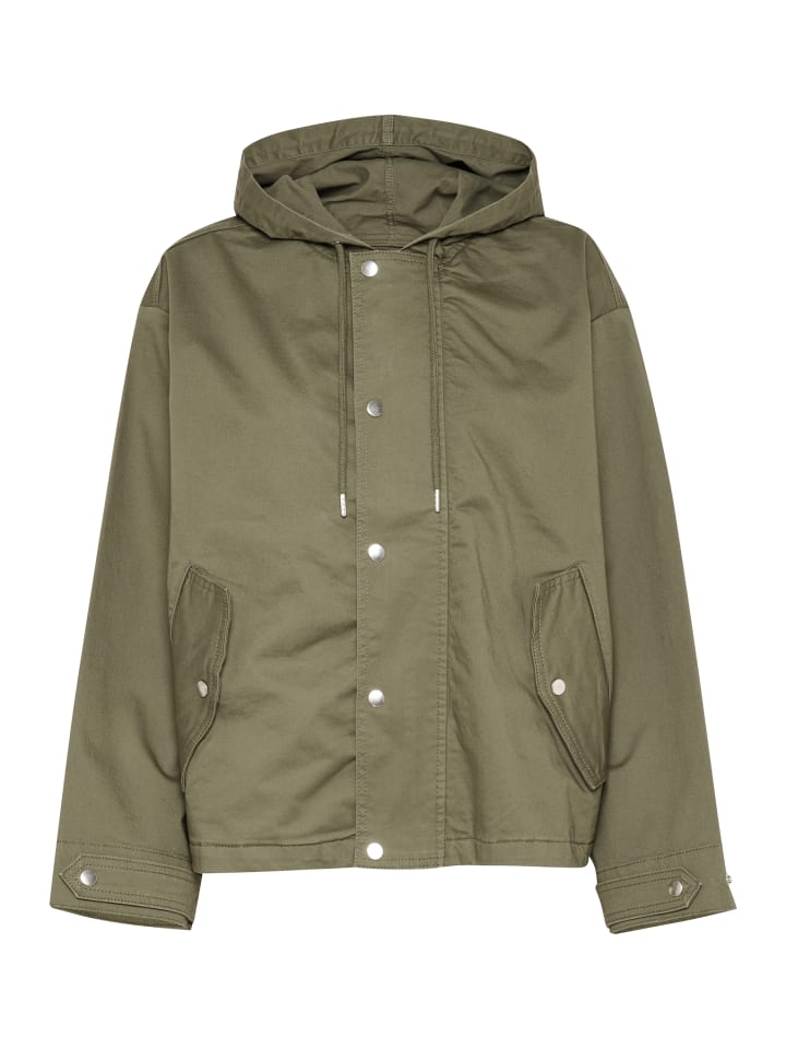 Куртка с капюшоном свободного, свободного кроя. Застежка на кнопки, косые передние карманы и регулируемые манжеты создают стильный образ.