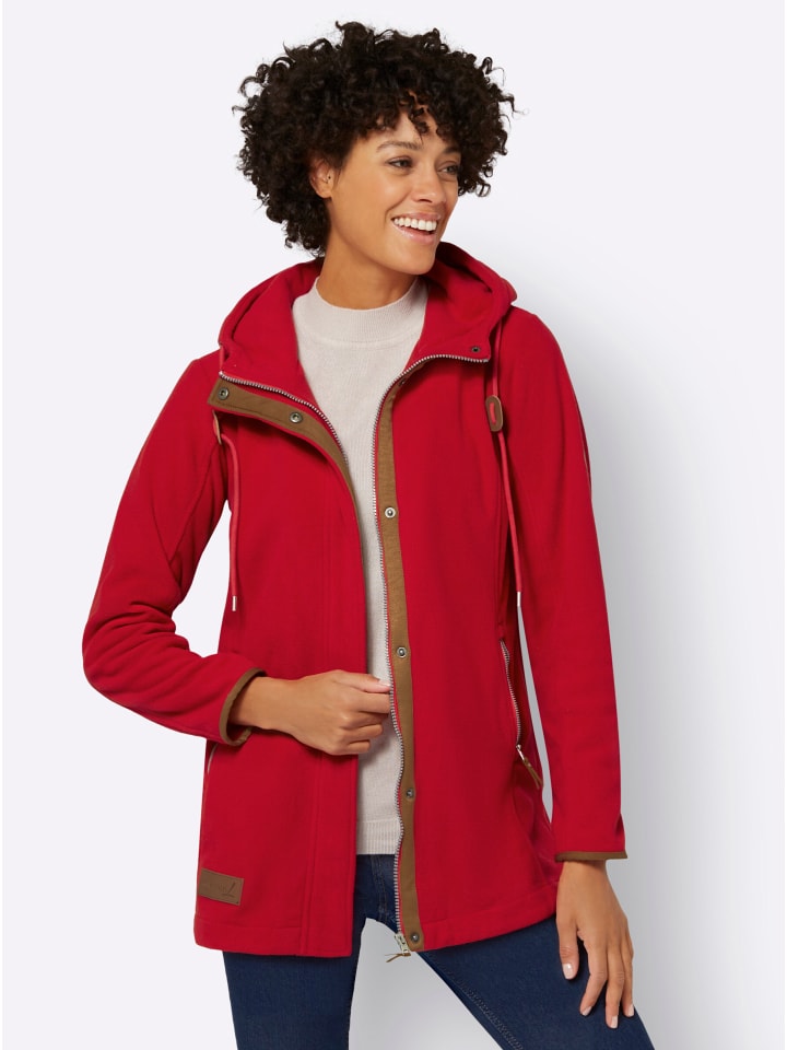 Спортивный стиль: модная удлиненная модель и контрастная окантовка. Теплая флисовая куртка из переработанного полиэстера. Детали: капюшон на шнурке, потайная молния с контрастной планкой на кнопках внутри, практичные карманы на молнии и длинные рукава. Формирующие швы обеспечивают отличную посадку.