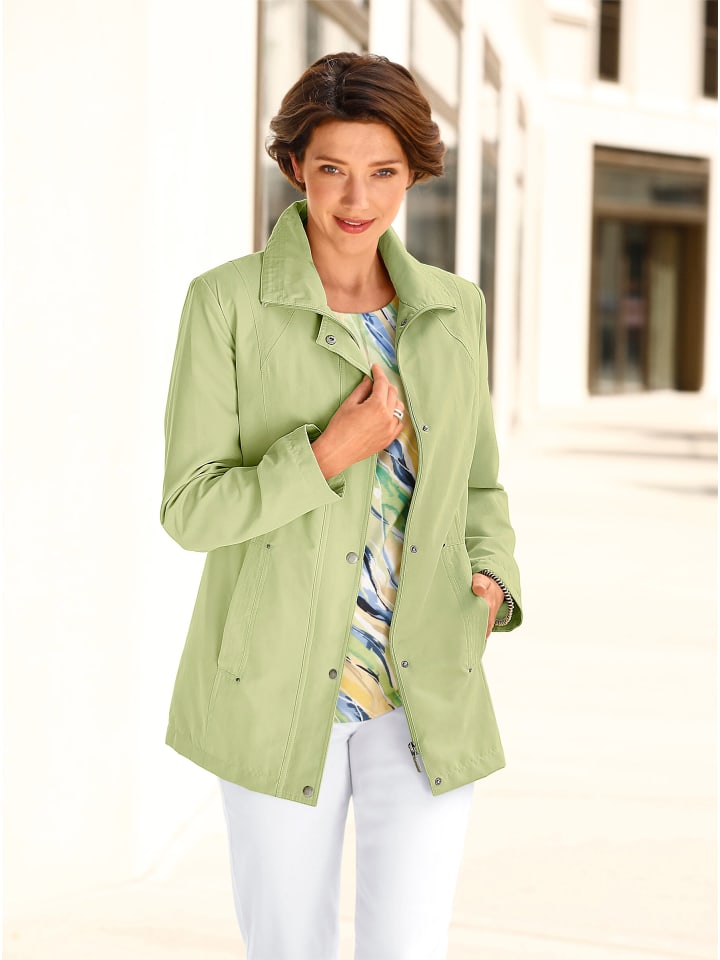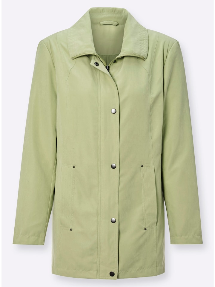 Идеально подходит для межсезонья! Эта куртка выполнена из дышащей, ветро- и водоотталкивающей, простой в уходе замши, мягкой на ощупь и обеспечивающей легкое тепло. Отложной воротник, подплечники, длинные рукава, карманы с декоративной строчкой и заклепками, планка на кнопках с потайной молнией и практичный внутренний карман на пуговице. Передние и задние швы создают изящный силуэт.