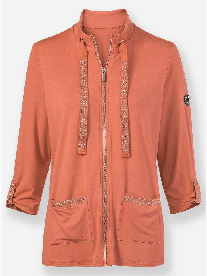 Эта рубашка-куртка приятная на ощупь, легкая и стильно украшена стразами: на завязке для регулирования воротника-стойки, на двух карманах и на хлястике рукава 3/4. Застежка-молния по всей длине. Блестящая аппликация на плече.
