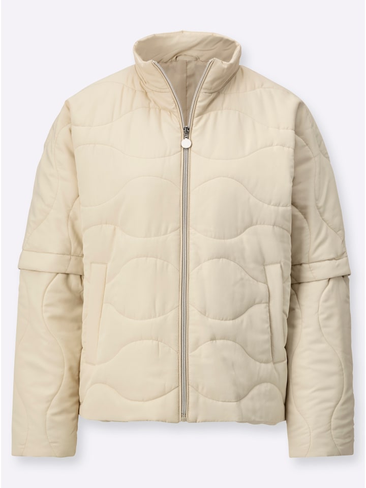 Идеально подходит для межсезонья: куртка с двумя функциями. Благодаря отстегивающимся рукавам эту куртку можно носить как жилет. Имеет модную волнистую стежку, защитный воротник-стойку и застежку-молнию. Два косых прорезных кармана и один внутренний карман на пуговице.