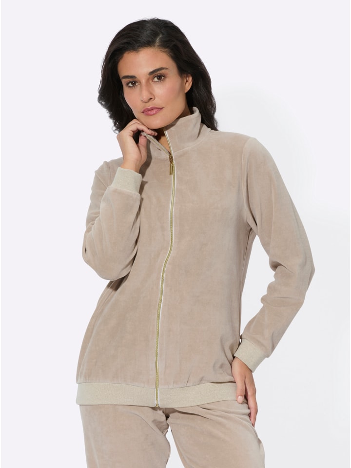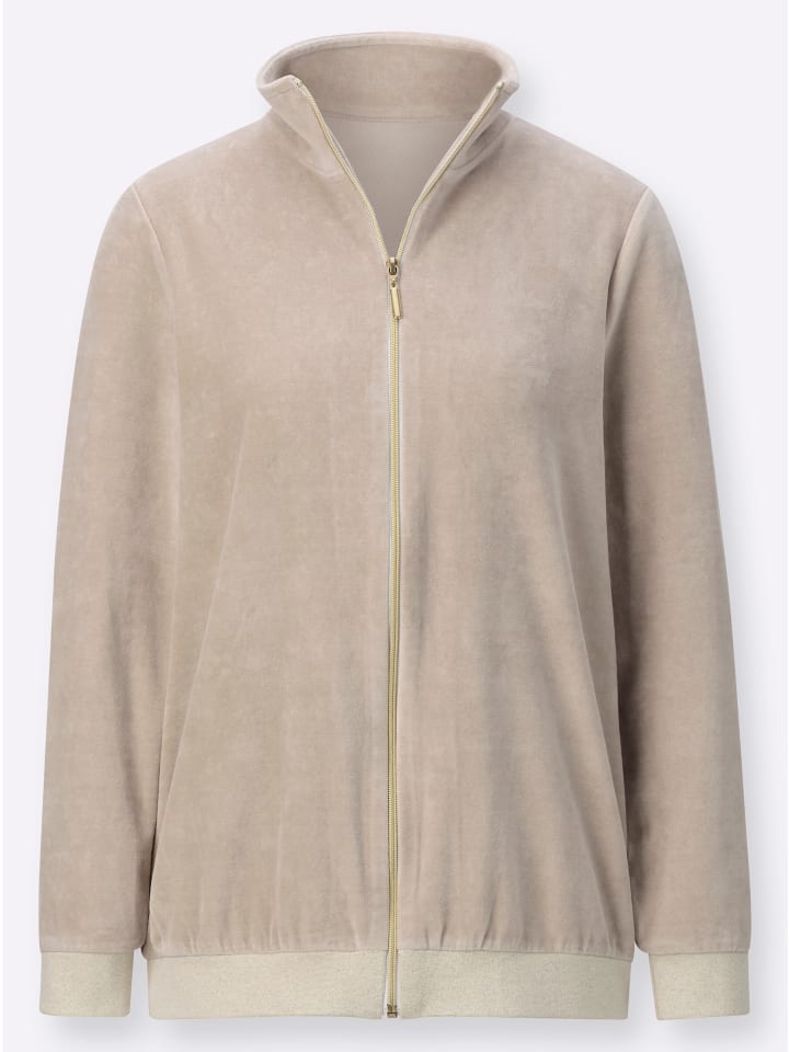 Мягкая, приятная на ощупь куртка от Plantier из бархатистого велюра. Элегантная золотистая молния до самого верха позволяет застегнуть отложной воротник в стойку. Манжеты длинных рукавов и подол украшены сверкающими нитями.