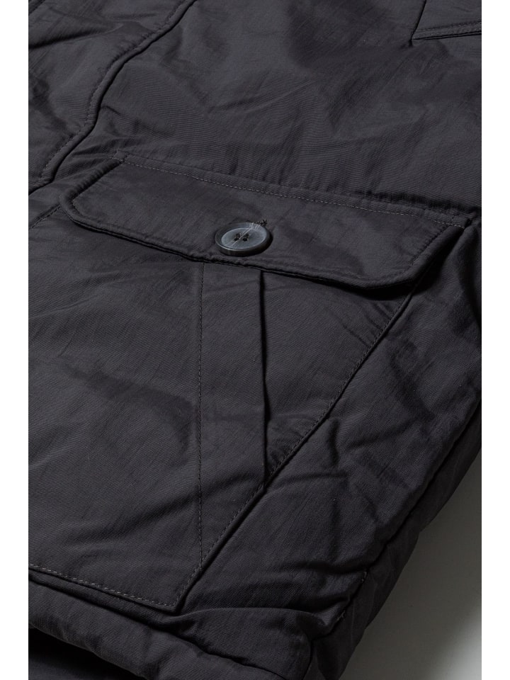 Стеганая куртка-пуховик. Капюшон на подкладке со съемной отделкой из искусственного меха. Воротник-стойка, застежка на молнию и пуговицы. Передние карманы и один нагрудный карман на молнии. Подкладка. Нашивка на плече.