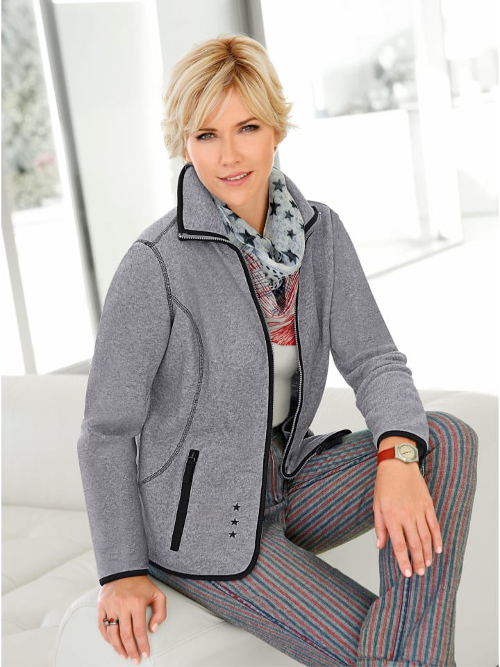 Пушистая флисовая куртка с вышитыми звездами спереди. Отложной воротник можно носить как защитный воротник-стойку. Застежка-молния по всей длине, 2 кармана на молнии и контрастная окантовка по краям. Антипиллинговая отделка предотвращает появление некрасивых катышков.