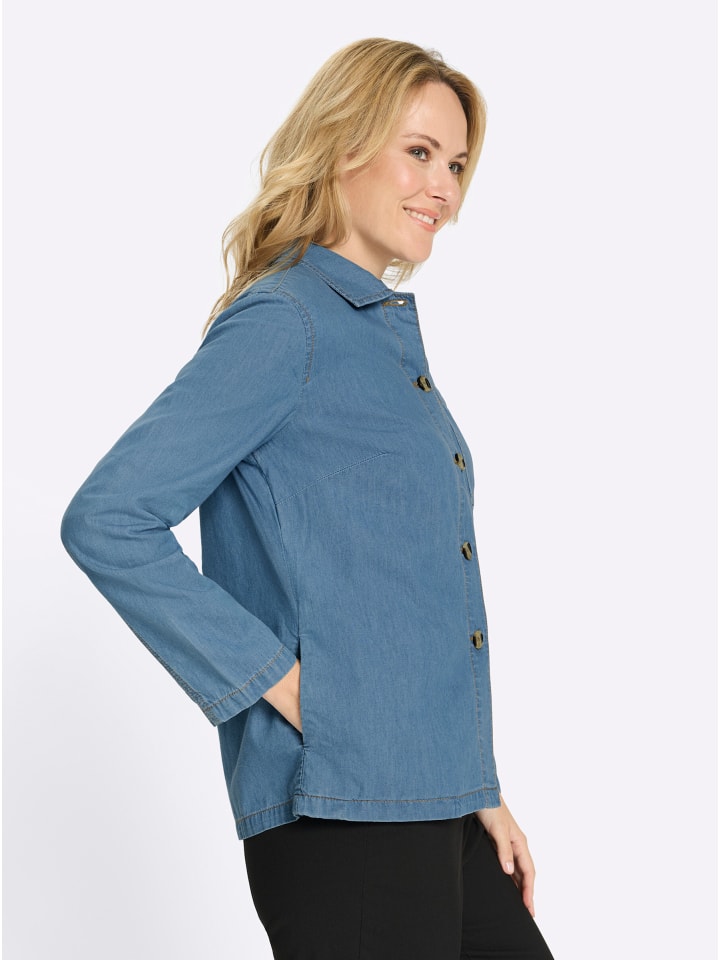 Модная джинсовая куртка из легкого денима. Формирующие вытачки спереди и кокетка сзади обеспечивают оптимальную посадку. Отложной воротник, накладной нагрудный карман и карманы в швах. Декоративные пуговицы с роговым узором.