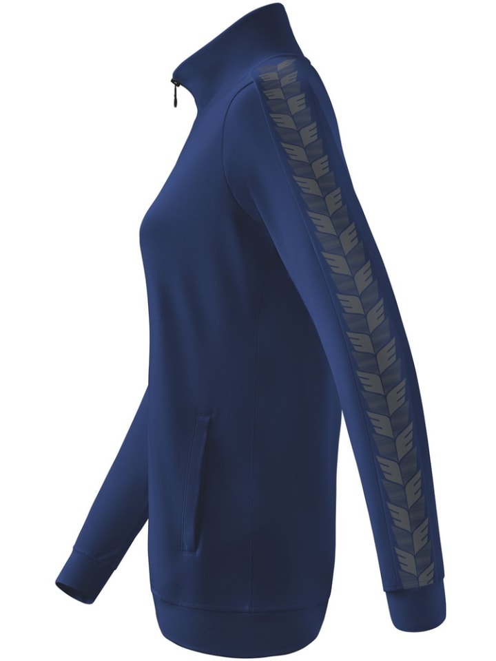 Удобный и прочный материал; воротник-стойка; ребристые манжеты и подол; боковые карманы на молнии; принт с крыльями ERIMA на плечах и рукавах; приталенный крой.
