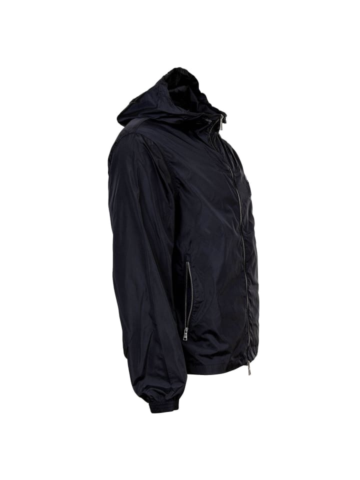 Легкая ветровка от бренда ARMANI EXCHANGE. Застежка-молния и практичный капюшон. Небольшой логотип на груди. Ветрозащитный материал.