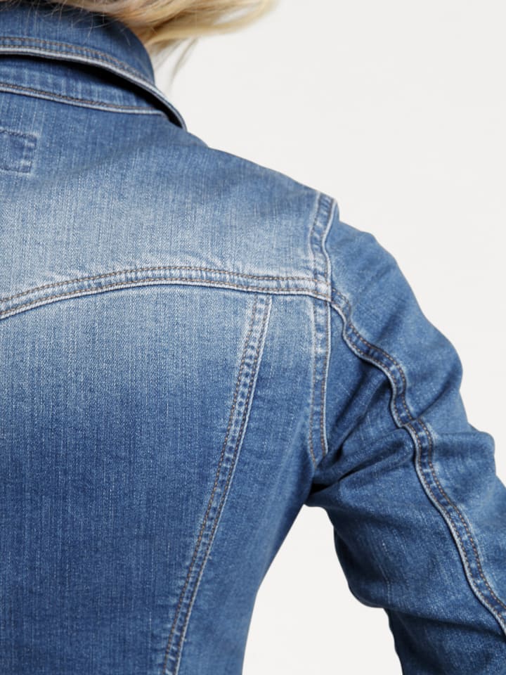 Джинсовая куртка с легкой потертостью. Отличное качество денима. Слегка приталенная, с воротником и планкой на пуговицах. Длинные рукава можно небрежно закатать.