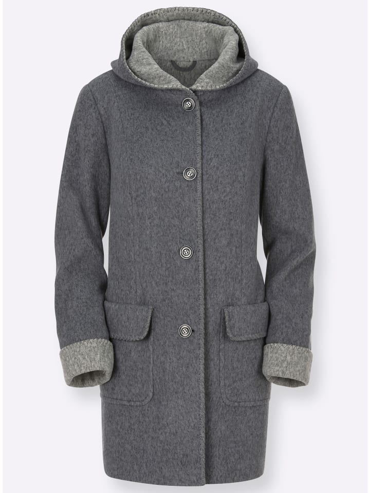...и зима может наступить! Приятная теплая куртка с шерстяным эффектом. Декоративная строчка по краям. Контрастный капюшон, планка на пуговицах и приталенные манжеты создают красивый контраст. Планка на пуговицах по всей длине, два кармана с клапанами. Формирующие передние швы, центральный шов сзади.