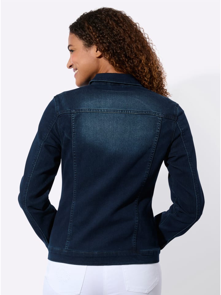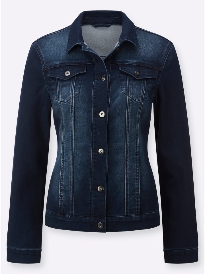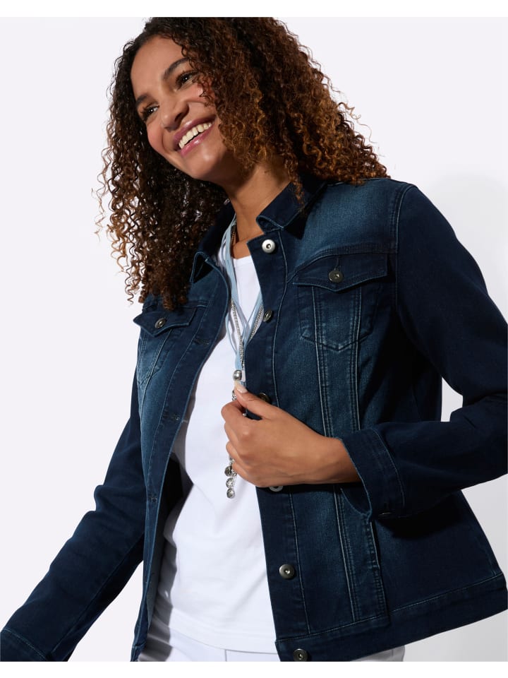 Эта джинсовая куртка - классика и одновременно современность, обеспечивающая исключительный комфорт благодаря эластичной ткани. Она имеет рубашечный воротник, кокетку и планку с пуговицами. Также имеются нагрудные карманы с клапанами на металлических пуговицах и карманы в боковых швах. Длинные рукава имеют манжеты на пуговицах. Соответствует инициативе «Хлопок, сделанный в Африке».